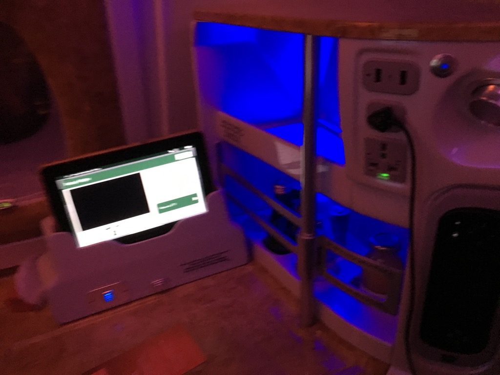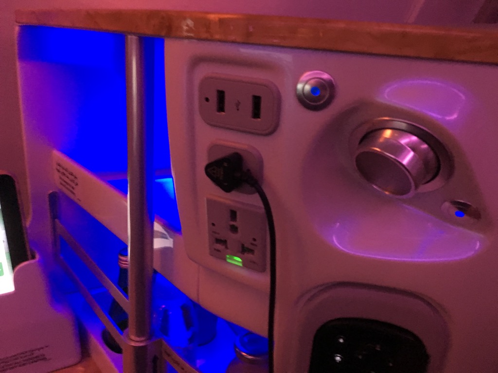 Direkt neben dem Sitz befindet sich eine große Ablagefläche, unter welcher sich auch der Tisch versteckt. Hier befindet sich auch das Pad zum Bedienen des IFE und des Sitzes, sowie die Minibar in welcher man schon vor dem Start einige alkoholfreie Getränke findet. Auch die Kopfhöreranschlüsse, die Steckdose und den USB Anschluss befinden sich hier gut zugänglich.