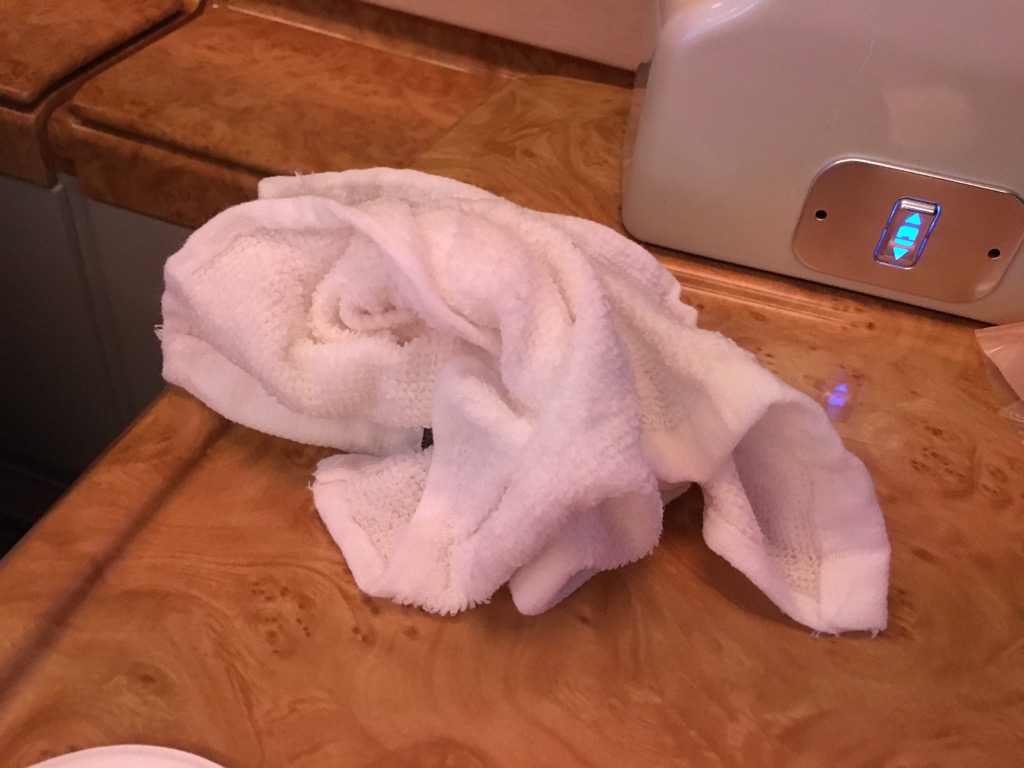 Kaum hatte ich meinen Sitzplatz eingenommen, wurde mir als Welcome Drink Champagner, Saft oder Wasser angeboten. Kurz darauf wurden auch heiße Tücher verteilt.