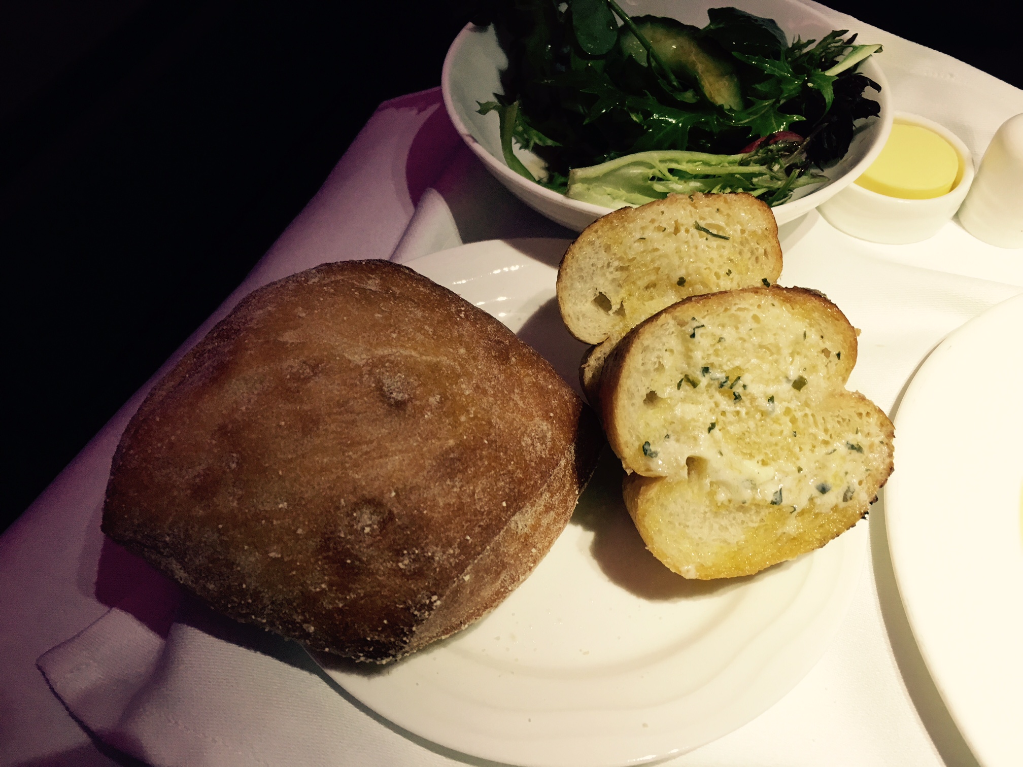 Zur Vorspeise gab es auch einen kleinen Salat und ein warmes Brötchen, welches bereits auf meinem Brotteller lag, als mir die Vorspeise serviert wurde. Kurz darauf wurde mir von einer Flugbegleiterin noch ein Brotkorb angeboten, aus welchem ich mir ein wenig Kräuterbutterbaguett servieren lies.