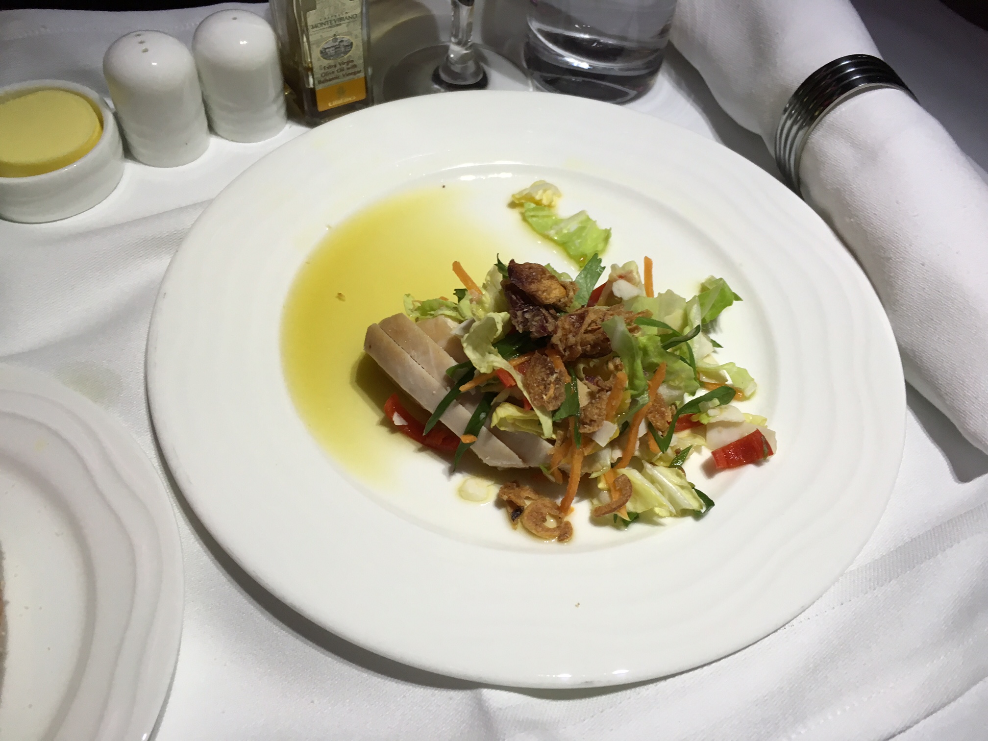 Die Vorspeise wird in der Emirates Business Class auf einem Tablet zusammen mit einem Salat und dem Brotteller serviert. Auch wenn ich die Präsentation der Vorspeise durchaus gut finde, bin ich kein Fan von Tablets in der First- oder Business Class. Mein asiatisches Huhn mit Mango- Chili Marinade war gut, wenn auch nicht spektakulär.