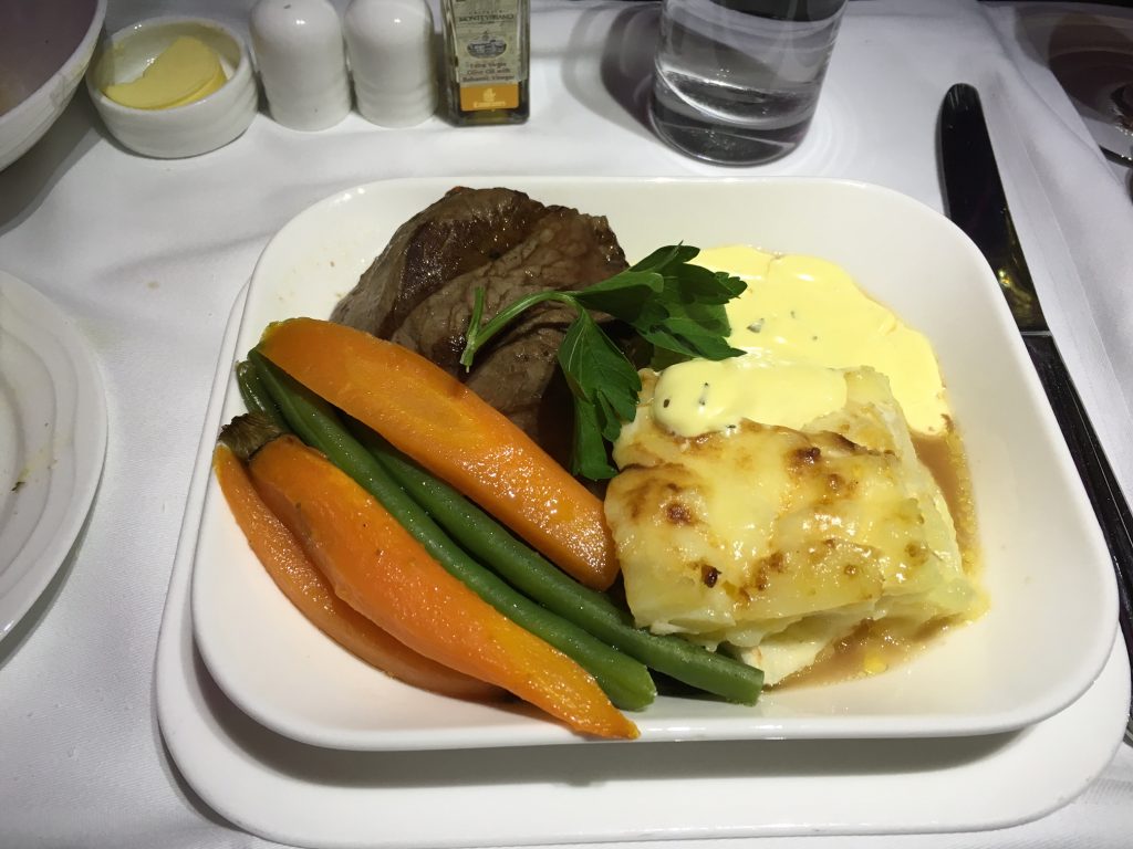 Beim Hauptgang habe ich mich für das Rinderfilet entschieden. Dieses war auch absolut in Ordnung und ich habe im Flugzeug durchaus schon schlechteres Essen serviert bekommen, allerdings ist besonders hier aufgefallen, dass Emirates beim Catering in der Business Class in den letzten zwei Jahren deutlich eingespart hat. Hier wurden früher noch deutlich hochwertigere Gerichte serviert. Jaja… Die gute alte Zeit ;).