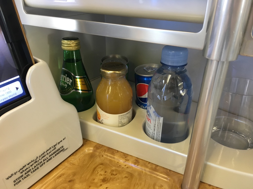 Generell bietet der Sitz bauartbedingt viel Ablagefläche. So hat jeder Passagier neben seinem Sitz eine große Ablage über dem Fußfach des Hintermannes und auch noch eine weiteres Ablagefach direkt dahinter. In diesem kleinen Regal ist auch die eigene Minibar untergebracht, in welcher für jeden Passagier vor dem Start schon alkoholfreie Getränke warten.