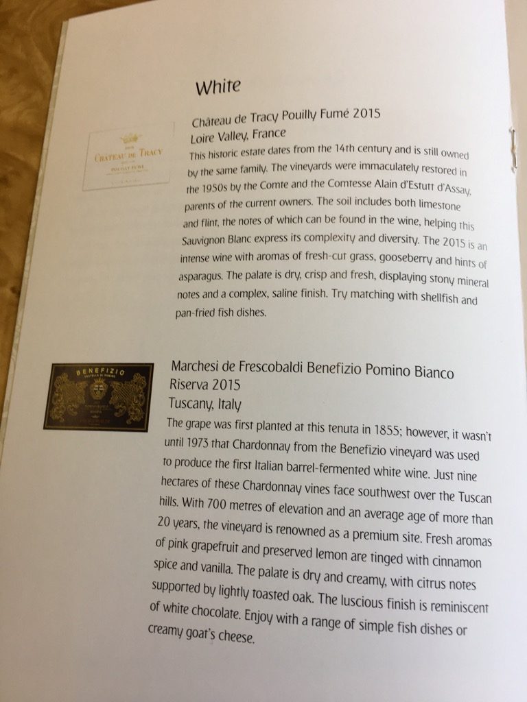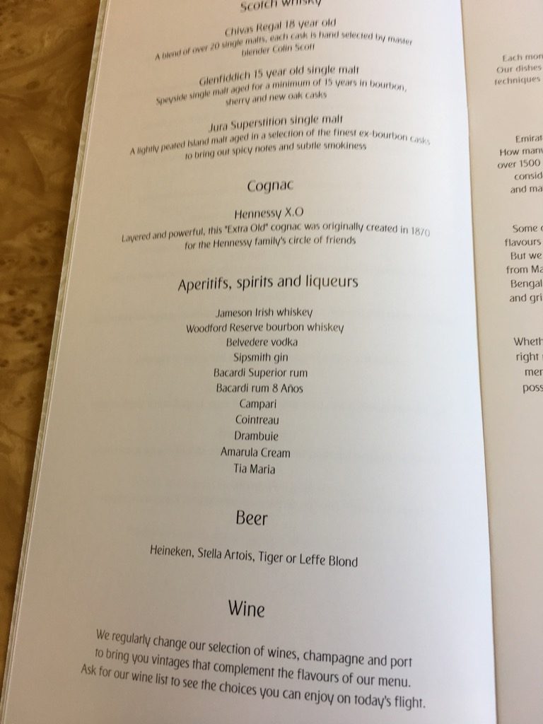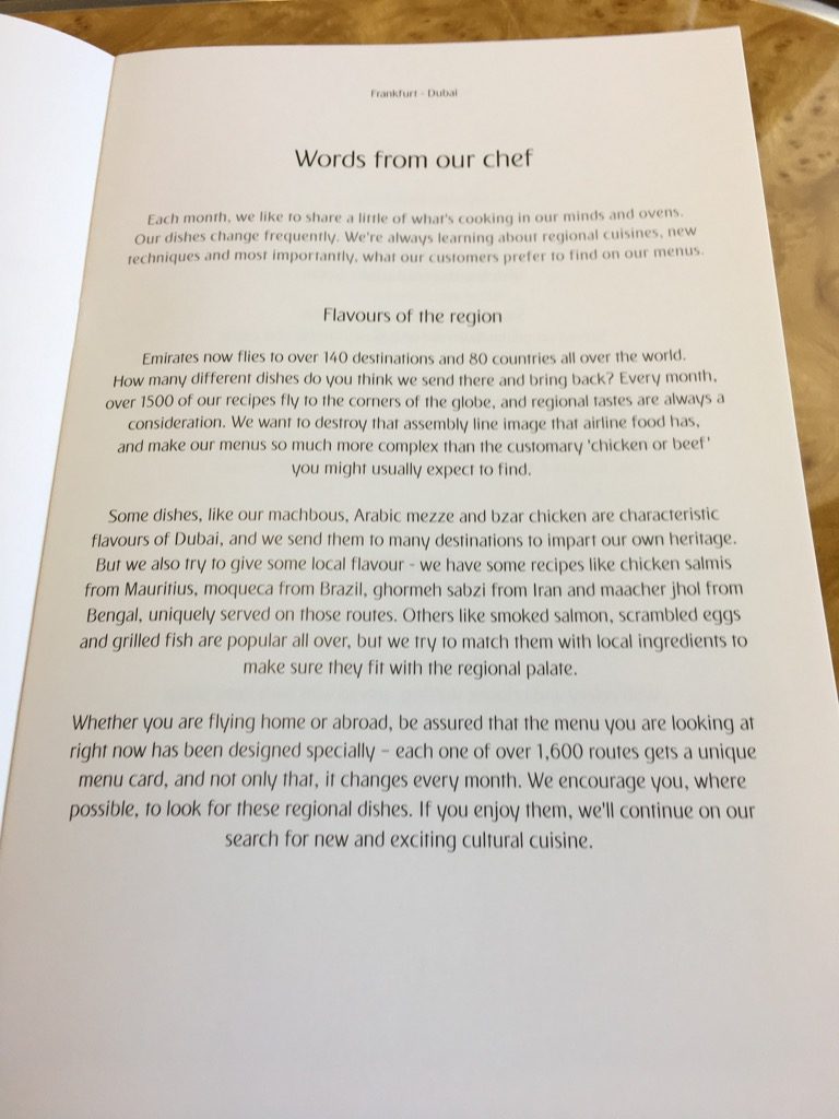 Die Speise- und Weinkarte in der Emirates Business Class war auf dem Flug von Frankfurt nach Dubai recht umfangreich.