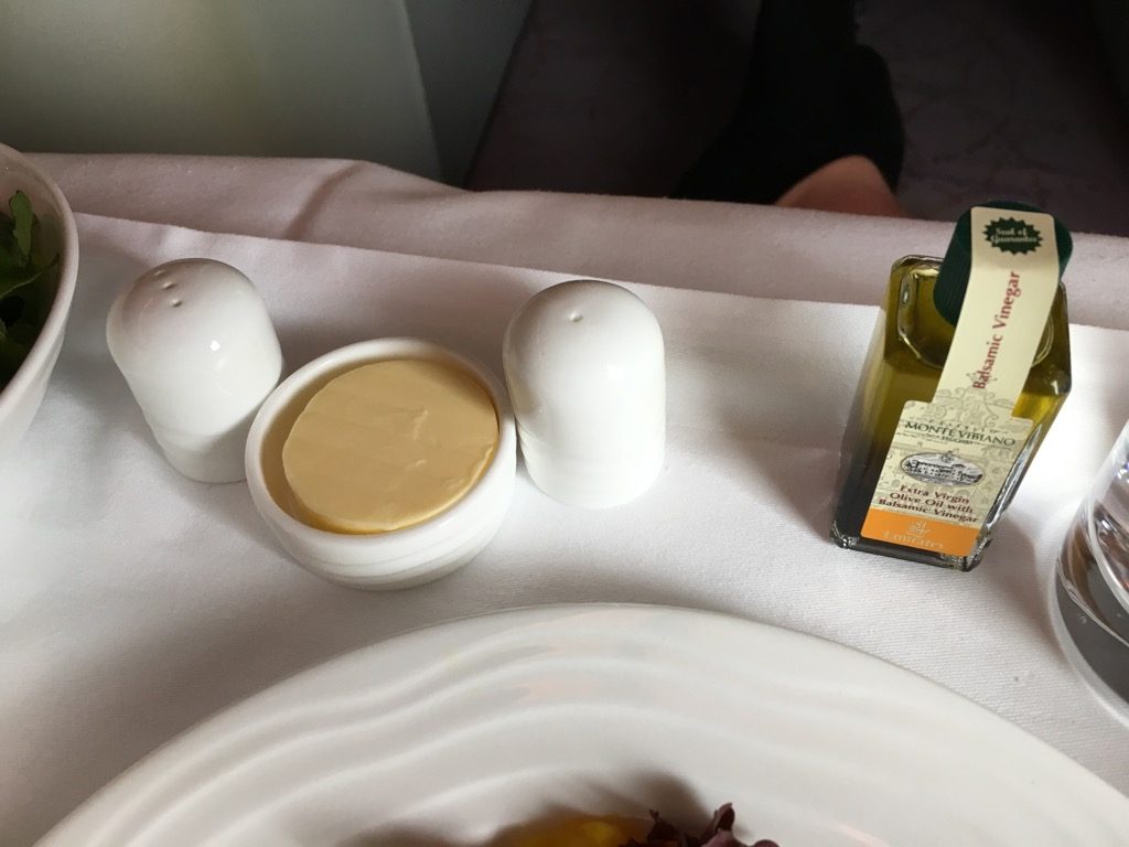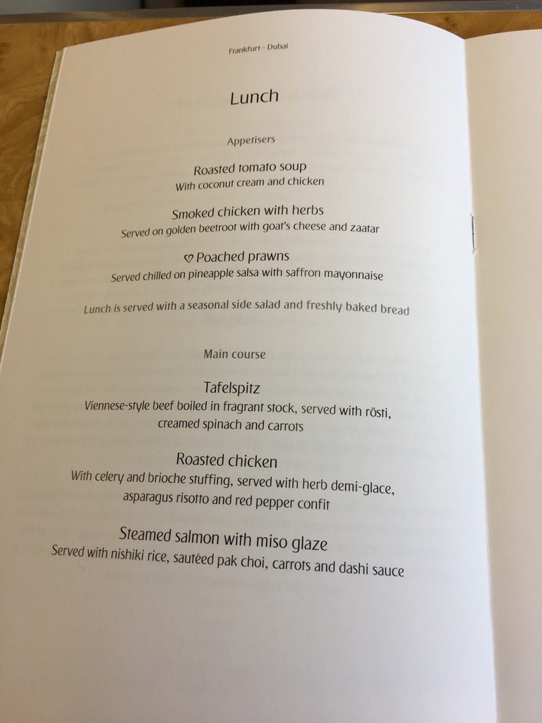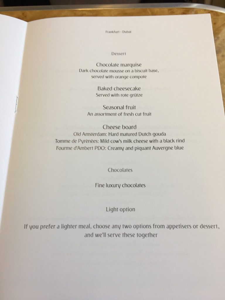 Die Auswahl an Vorspeisen, Hauptspeisen und Desserts las sich im ersten Moment fast wie ein dine on demand Menü, allerdings gibt es dies bei Emirates nicht. In meinen Augen ist dies in der Business Class allerdings auch nicht zwingend nötig.
