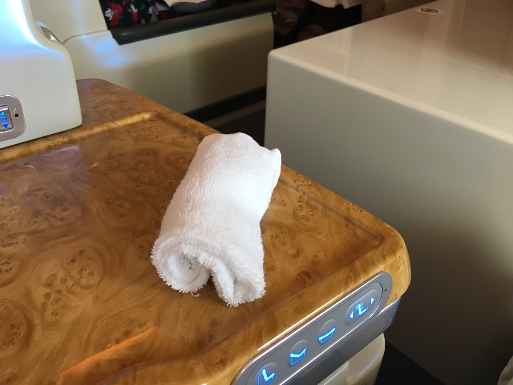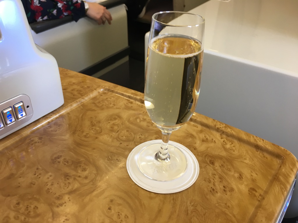 Kurz nachdem ich mich hingesetzt habe, hat mir eine freudig strahlende Flugbegleiterin ein riesiges Tablett mit Wasser, Saft oder Champagner zur Begrüßung angeboten. Kurz darauf brachte Ihr Kollege noch ein heißes Tuch.