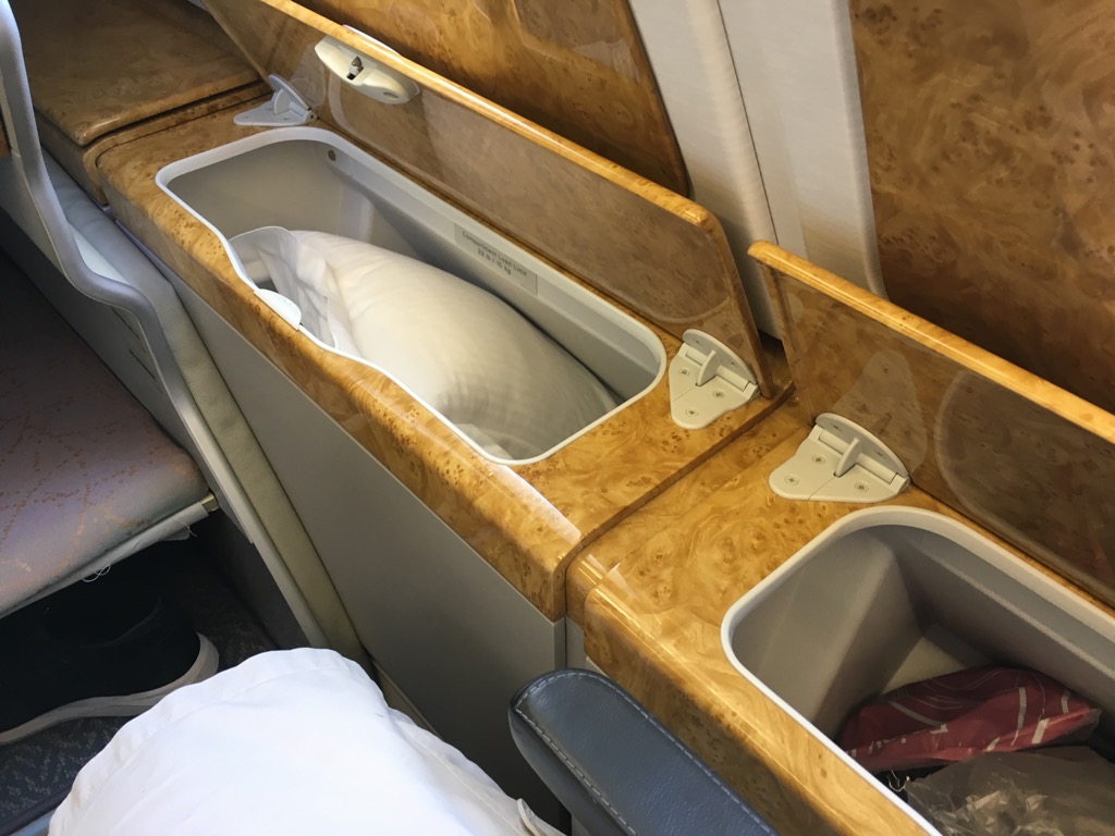 Ein weiterer großer Vorteil der Fenstersitze sind die Staufächer unter dem Fenster. Hier kann man wirklich viel unterbringen, inkl. einer Laptoptasche. Dies ist sehr angenehm, denn die Overhead Bins im Oberdeck des Airbus A380 sind verhältnismäßig klein.