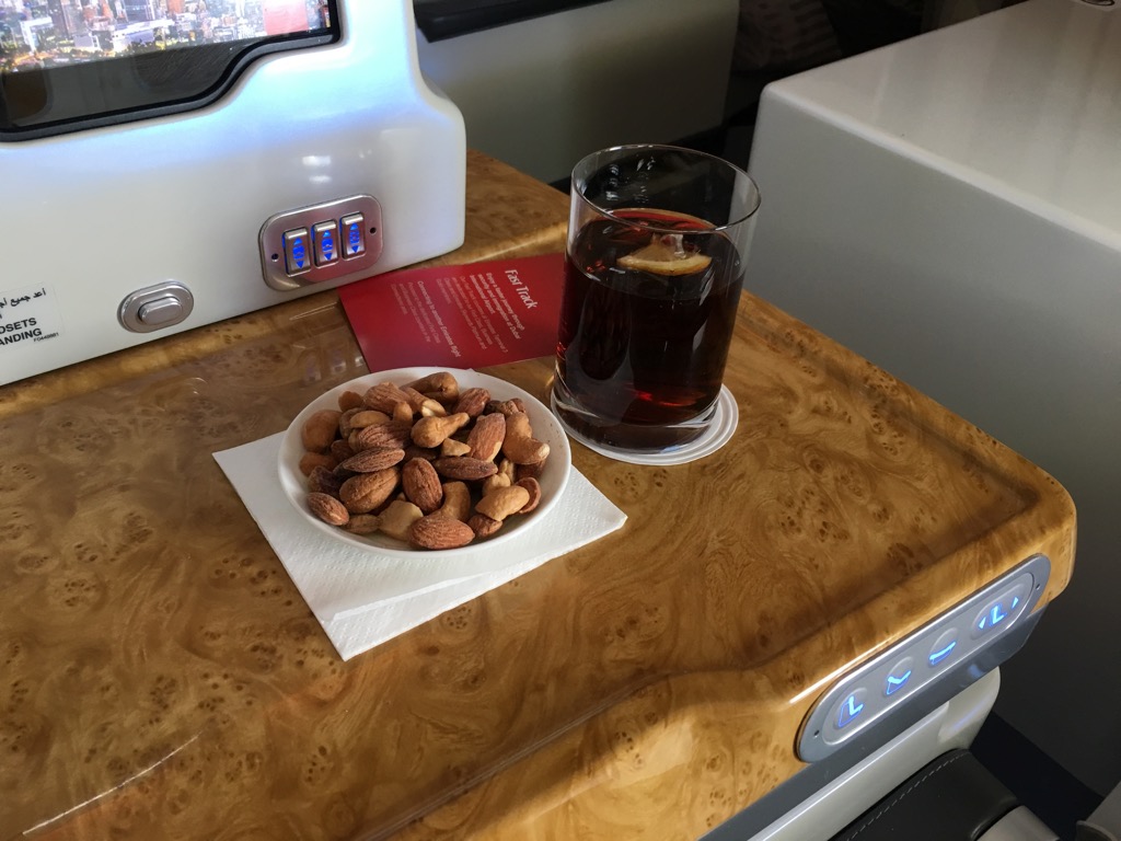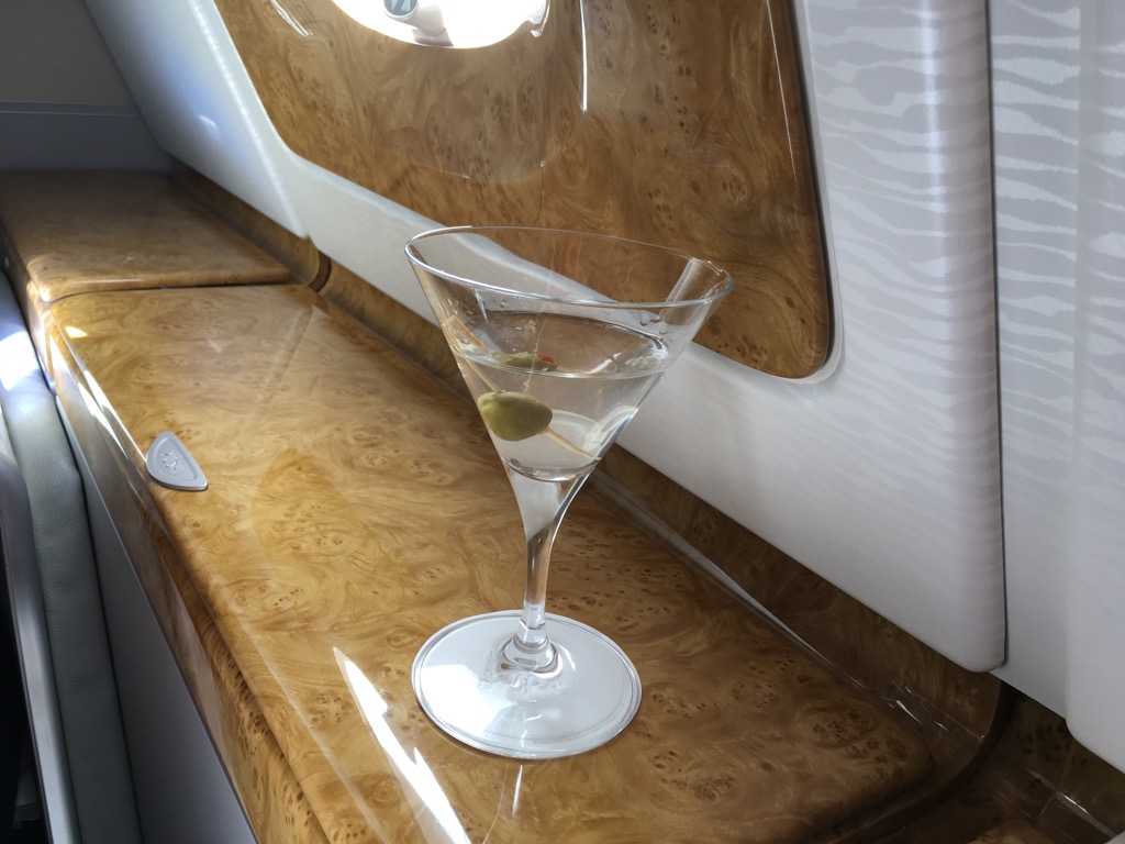 Etwa 20 Minuten nach dem Start in Frankfurt wurden die ersten Getränke serviert. Für mich bedeutetete dies eine Cola mit Nüssen und einen Martini, welcher ganz klassisch in einem Martini Glas serviert wurde. Dass Airlines so etwas an Bord haben ist selten und vermutlich der Bar von Emirates geschuldet.