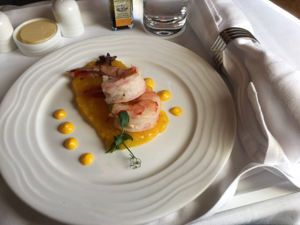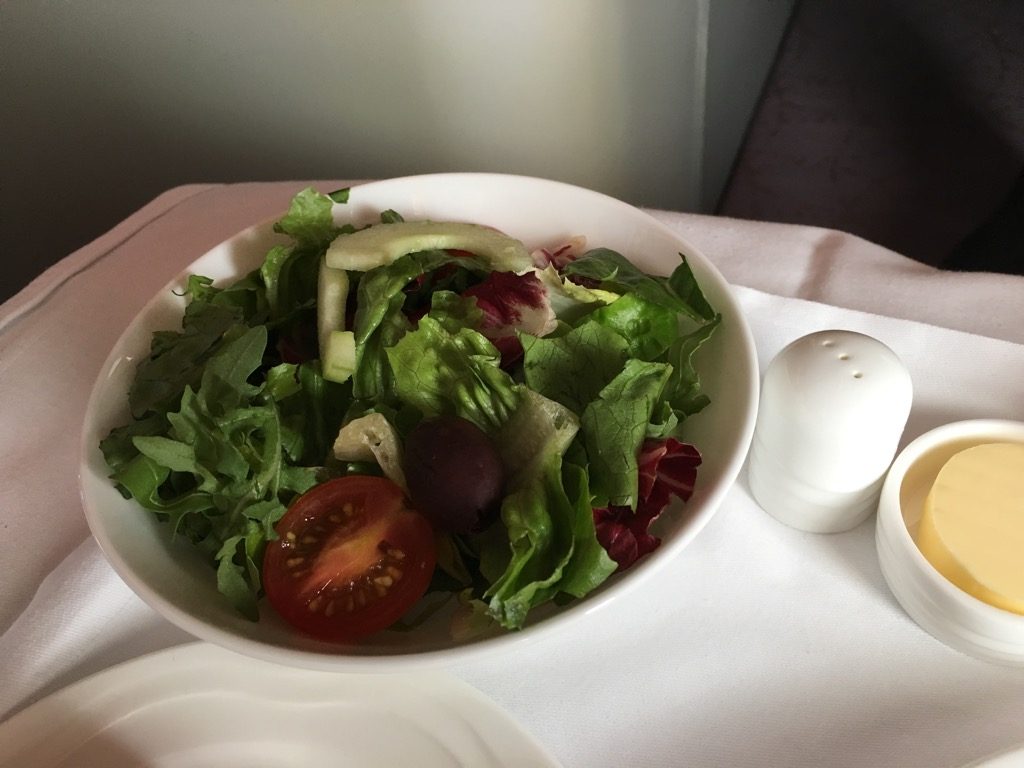 Die Vorspeise wurde zusammen mit einem Salat und einem Brötchen auf einem Tablett serviert. Auch wenn mir ein Tablett von der Präsentation her immer nicht wirklich gefällt, wirkte das Setup von Emirates doch sehr hochwertig. Wie gut würde es erst ohne Tablett aussehen?