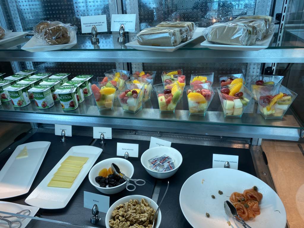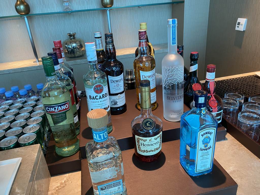 Auch für Getränke ist bestens gesorgt. So gibt es mehrere Kaffee- und Teestationen. Und Softdrinks stehen zur Selbstbedienung bereit. Die Auswahl an alkoholischen Getränken ist ebenfalls auf überdurchschnittlichem Niveau. So hat man sich zwar dazu verleiten lassen, Bacardi als Rum bereit zu stellen, dafür ist der Belvedere Vodka in meinen Augen schon oberes Lounge-Level. Gin Tonic Freunde können sich ihr Lieblingsgetränk mit Bombay Sapphire zubereiten.