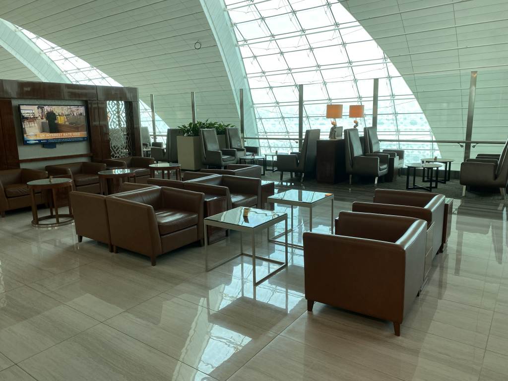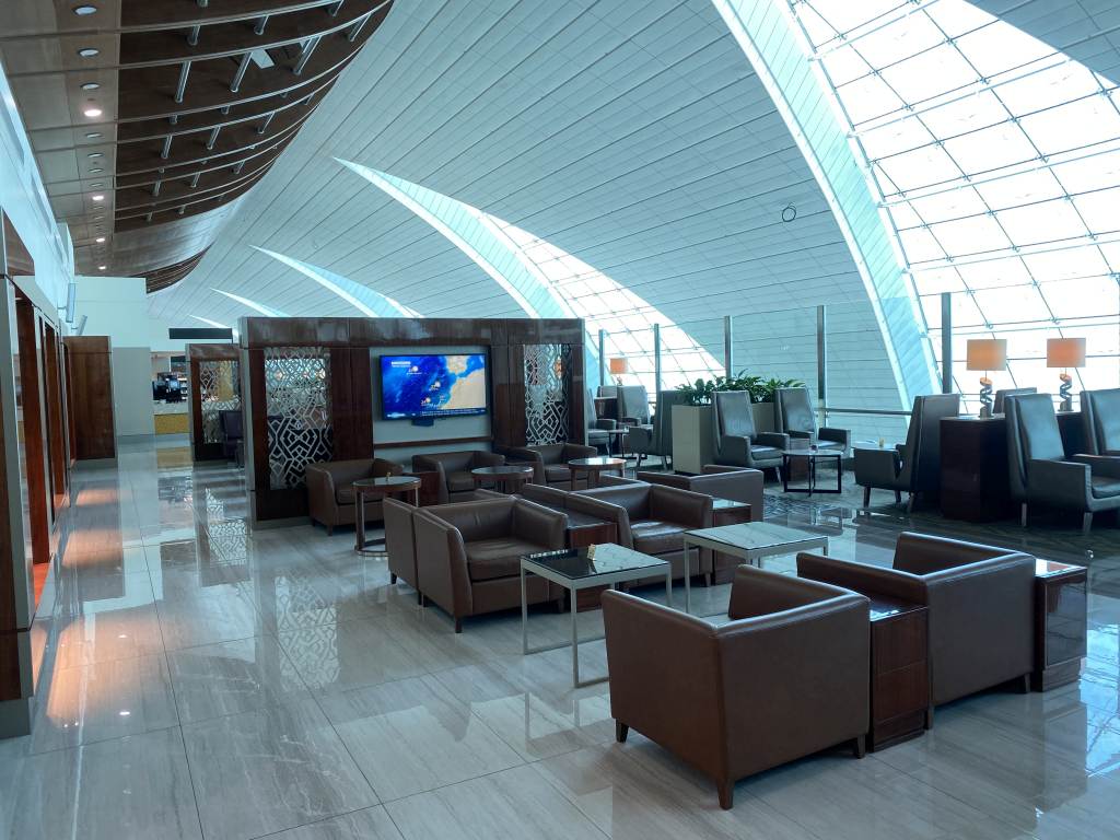 Die Emirates Business Class Lounge erhebt sich über dem eigentlichen Terminal auf einer gesamten Etage für sich. Wie von einer Empore hat man dabei Überblick über das Terminal. Durch diese Bauweise und die gewölbte Decke entsteht zu keinem Zeitpunkt der Eindruck, dass man sich in einem geschlossenen Raum befindet.