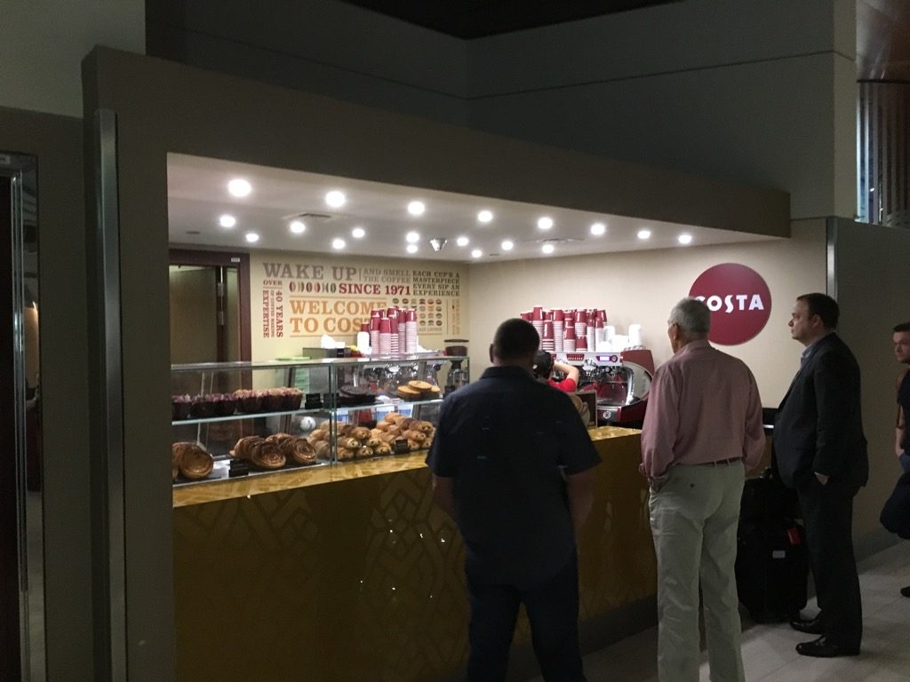 Was ich besonders bei den morgendlichen Abflügen gerne wahrnehme, ist der Stand von Costa Kaffee in der Lounge. Hier sind alle Produkte von Costa erhältlich und für die Lounge Gäste kostenlos. Man sollte sich nicht davon irritieren lassen, dass jede Bestellung in die Kasse eingegeben wird. Das Angebot ist kostenlos und man kann sich auch kurz vor verlassen der Lounge einen To Go Kaffee bestellen.