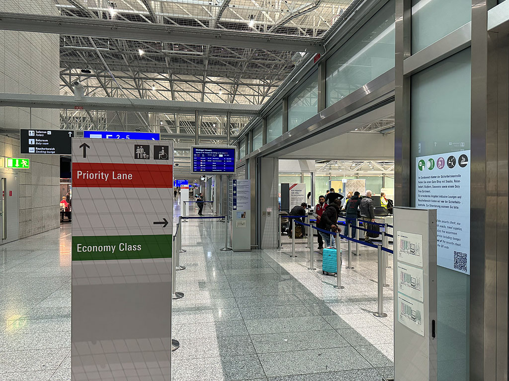 Da es am Frankfurter Flughafen in Terminal 2 für den Non-Schengenraum keine zentrale Sicherheitskontrolle gibt, erfolgte der Sicherheitscheck erst vor Betreten des abgezäunten Gate-Bereichs.