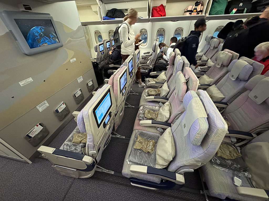 Im Unterdeck gibt es dann je nach Konfiguration 399 bis 429 Economy Class Sitze in 3-4-3 Anordnung. Auf meinem Flug umfasste die Ecoonomy Class 427 Sitzplätze (Nummerierung der Sitzplätze beginnt mit Reihe 41, Reihe 80 hat außen jeweils zwei Sitze).