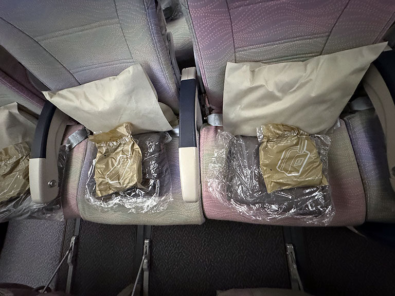 Auf den Plätzen liegen beim Boarding bereits Kopfhörer, Kissen und eingeschweißte Decken bereit. Die Decken empfand ich ausreichend groß, weich und warm. Das Kissen war zwar klein, aber ausreichend dimensioniert. Die Polsterung war ebenfalls passend.