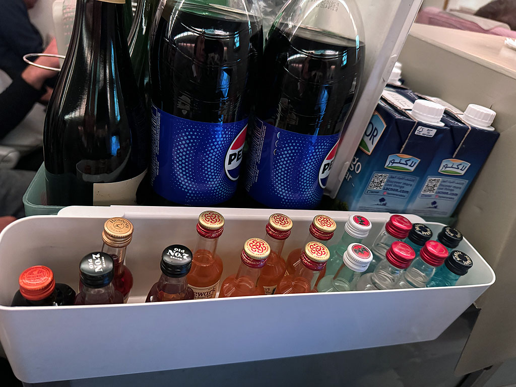 Die Getränkekarte umfasste auch alkoholische Getränke wie Bier (Heineken, Tiger, Stella Artois), Wein (rot, weiß) und Spirituosen (Jack Daniel’s, Dewar’s White Label, Smirnoff Wodka, Hennessy Cognac, Cointreau, Bombay Sapphire Gin, Bacardi Carta Blanca). Lediglich Champagner wird nicht gratis, jedoch zum Kauf angeboten (25 USD für 220ml Moët & Chandon). Zudem gibt es eine Auswahl bekannter alkoholfreier Getränke (Wasser, Sprudel, Apfel-, Orangen- und Tomatensaft sowie Pepsi, Orangen- und Zitronenlimonade).