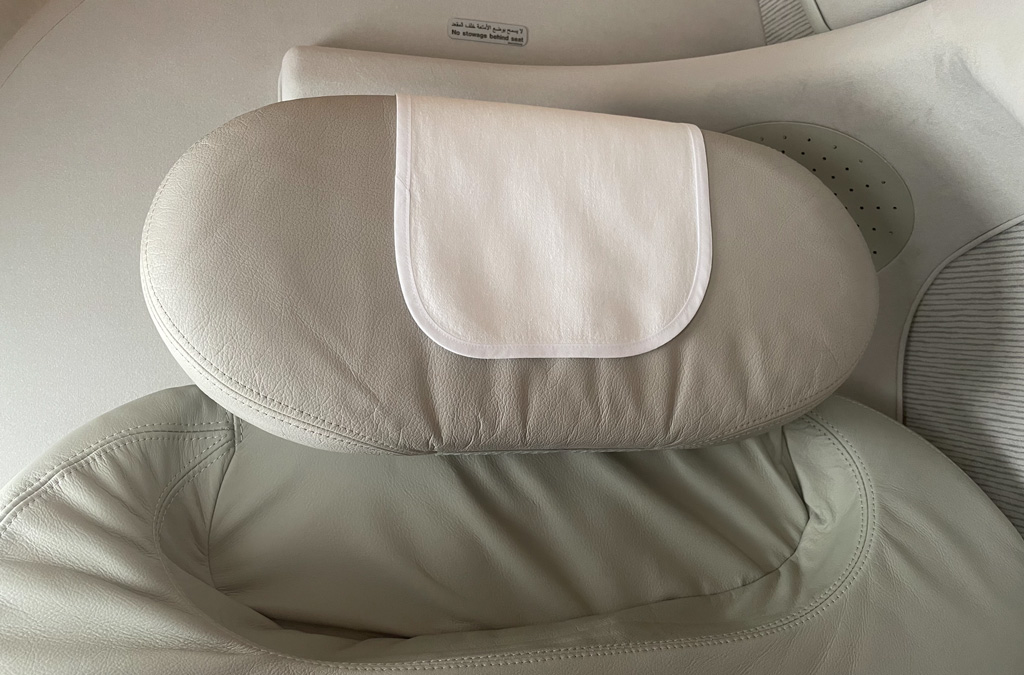 Etwas irritert war ich, als ich die Bettwäsche sah, die etwas lieblos zwischen Bordwand und Sitz gestopft wurde. Auch wenn es sicherlich toll ist, jederzeit Zugriff auf Bettwäsche zu haben und damit die Crew entlastet wird, halte ich die „Präsentation“ für eher nachteilig. Außerdem dürften nur selten Passagiere auf einem Zwei-Stunden-Flug am Nachmittag schlafen wollen.