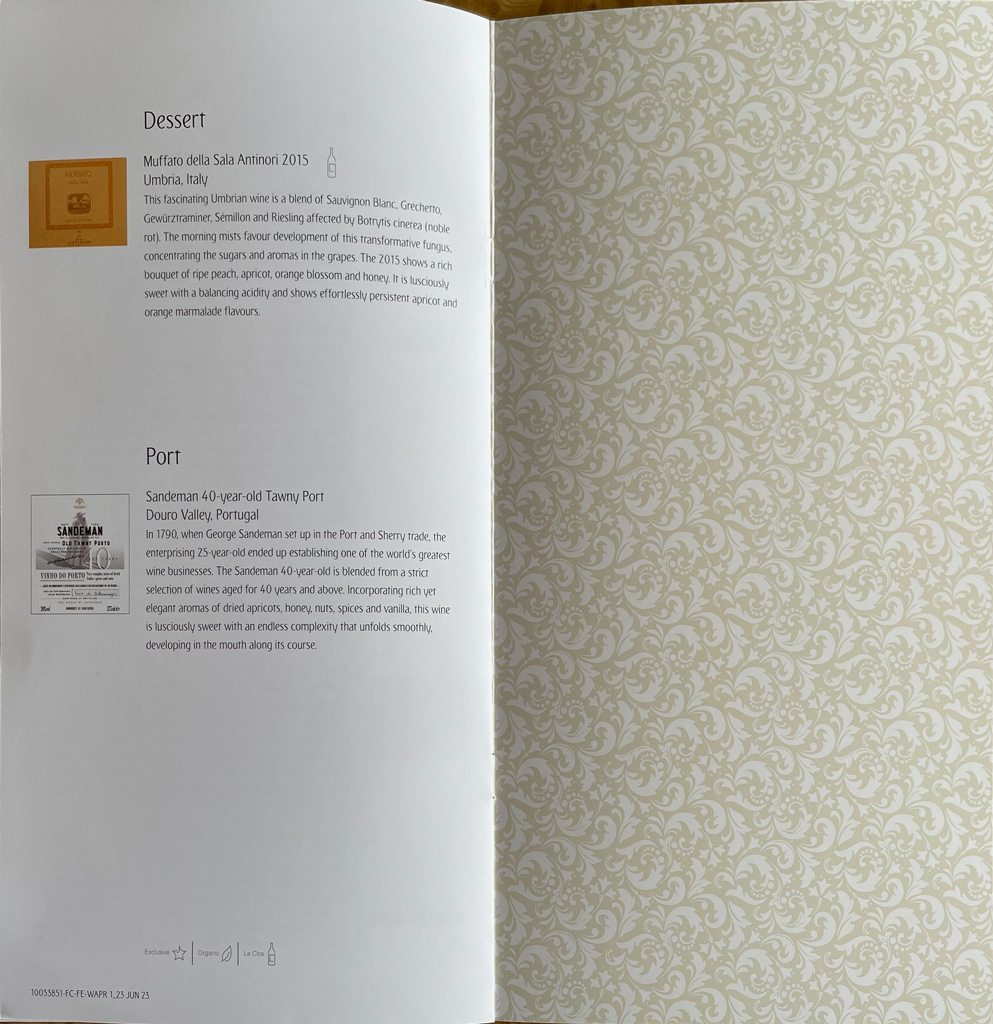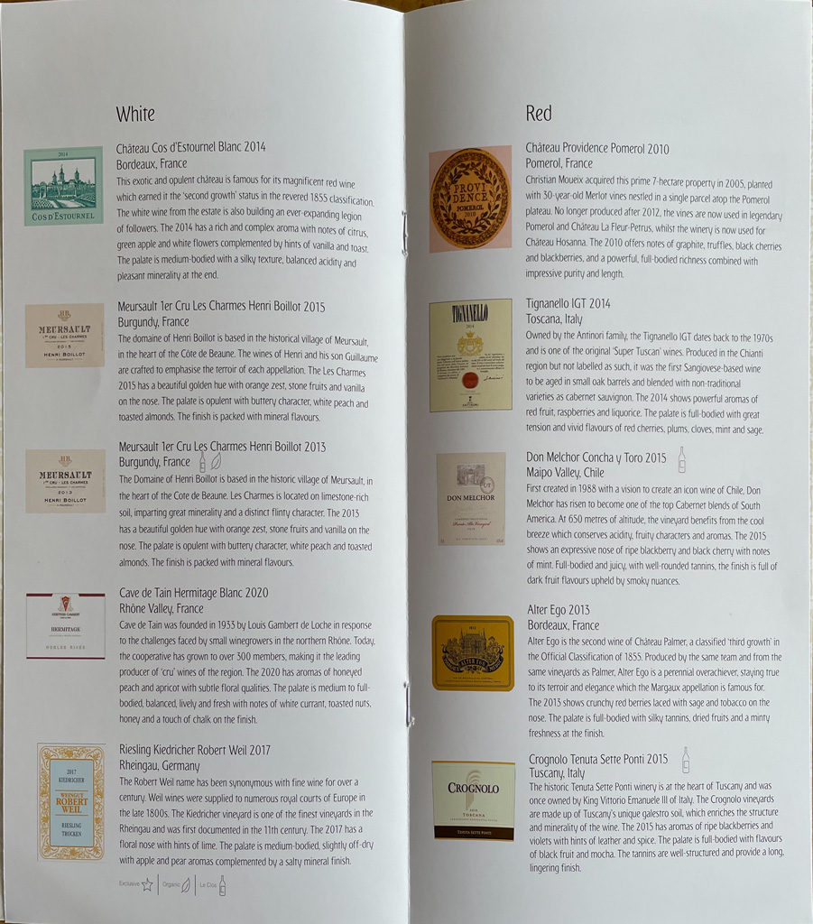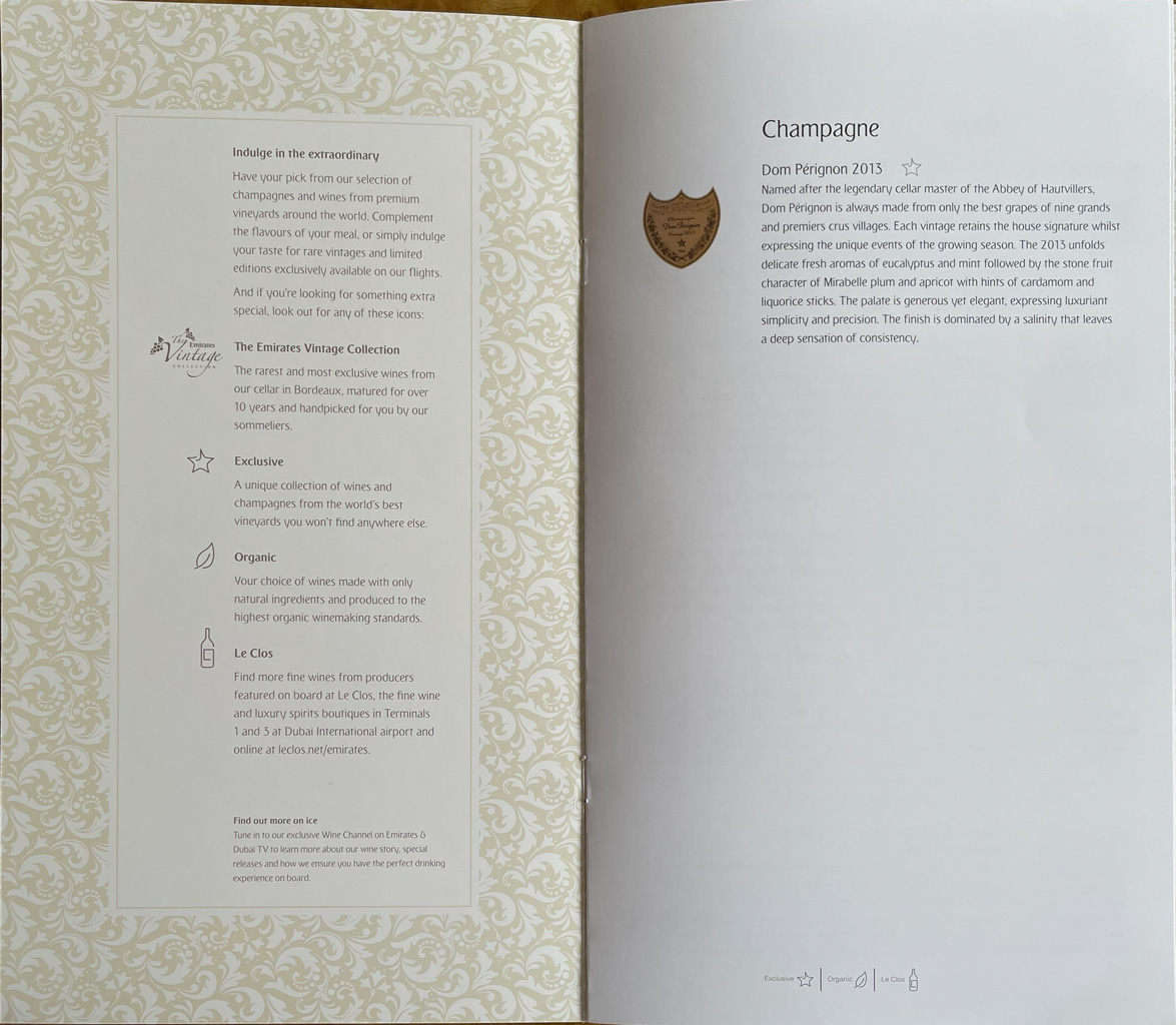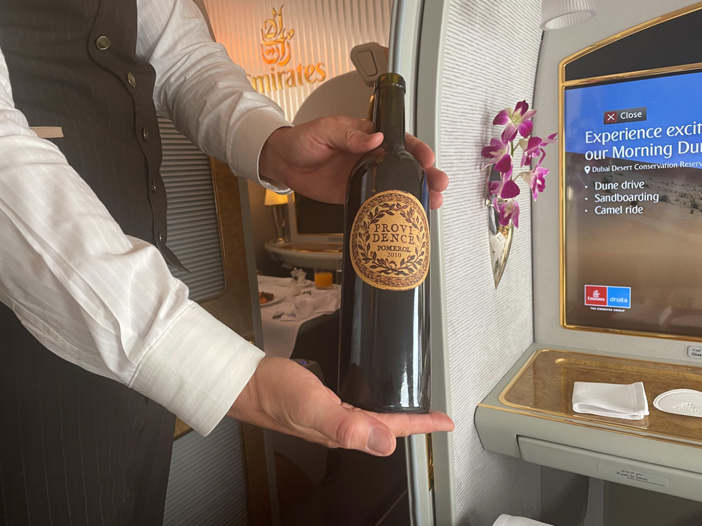 Dann stellte sich die Cabin Manager bei mir vor und erzählte mir, wie Emirates ganze Jahrgänge von ausgewählten Weinen aufkauft, um damit Passagiere exklusiv zu verwöhnen. Aus meiner Sicht ist das zum einen ein toller Gedanke und Marketing Gag, allerdings werden es solche Weine gegebenenfalls langfristig schwer haben, ihren Ruf zu verteidigen, sollten sie nicht regelmäßig unter regulären Bedingungen (d.h. am Boden und von vielen Menschen verkostet) ihren Geschmack unter Beweis stellen.