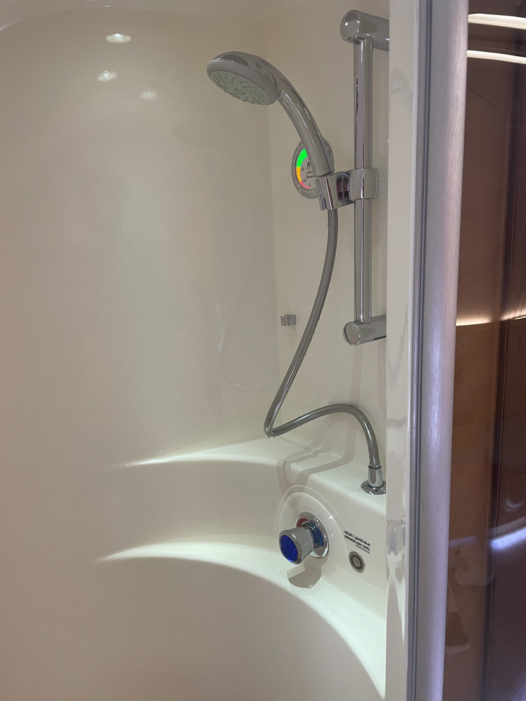 Alles, was Ihr zum Duschen braucht, findet Ihr dann im Badezimmer. Obwohl das Badezimmer für ein Flugzeug riesig ist, ist die Duschkabine verhältnismäßig klein. Eine Anzeige in der Duschwand zeigt Euch an, wie lange ihr noch Wasser habt. Der Wasserdruck war bei mir nicht überragend – zum Waschen ausreichend, zum Kärchern ungeeignet.
