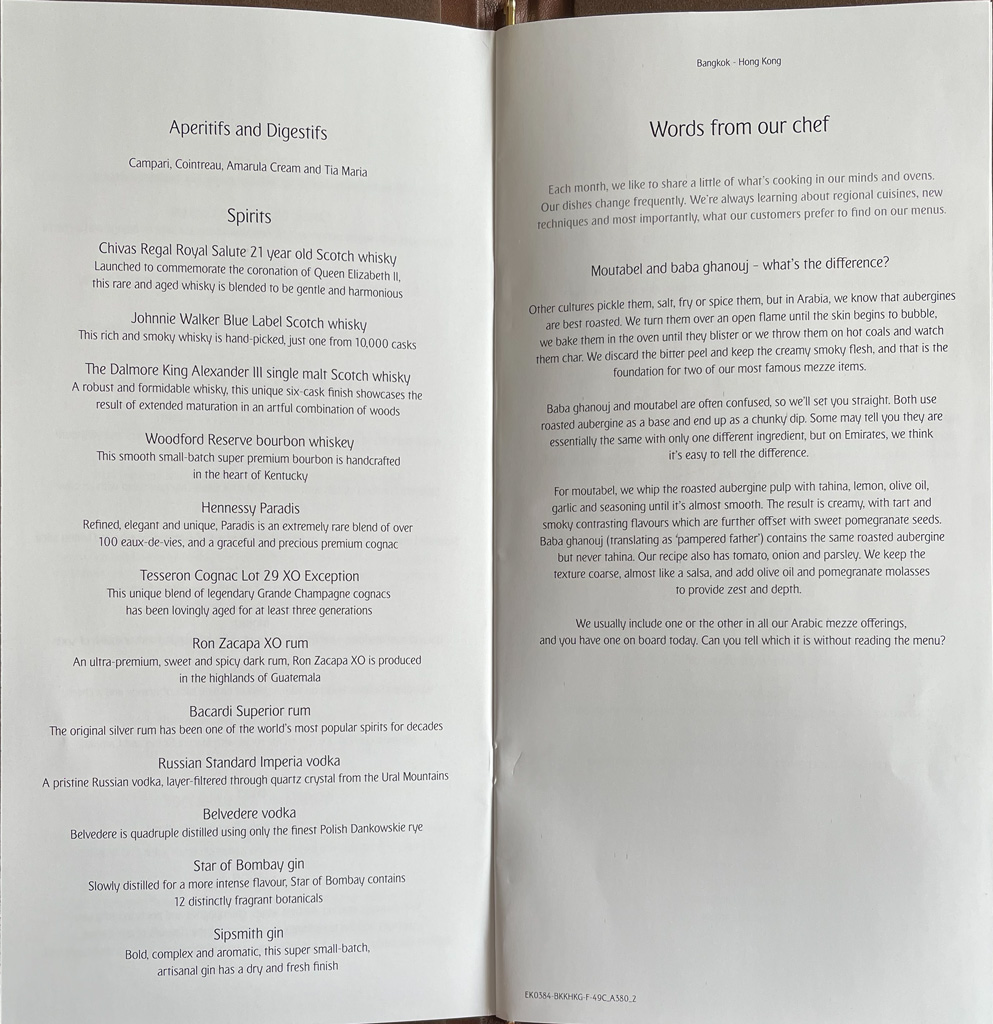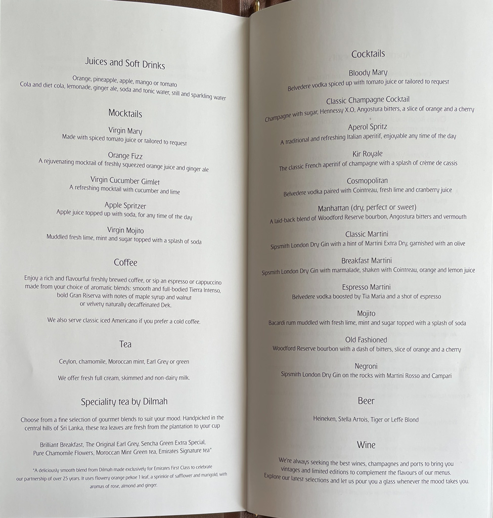 Die First Class Bar, die sich vorne „im Treppenhaus“ befindet, war auf diesem Flug nicht bestückt. Dafür gibt es (bis auf den Kaviar) die komplette Karte von Emirates in der First Class.