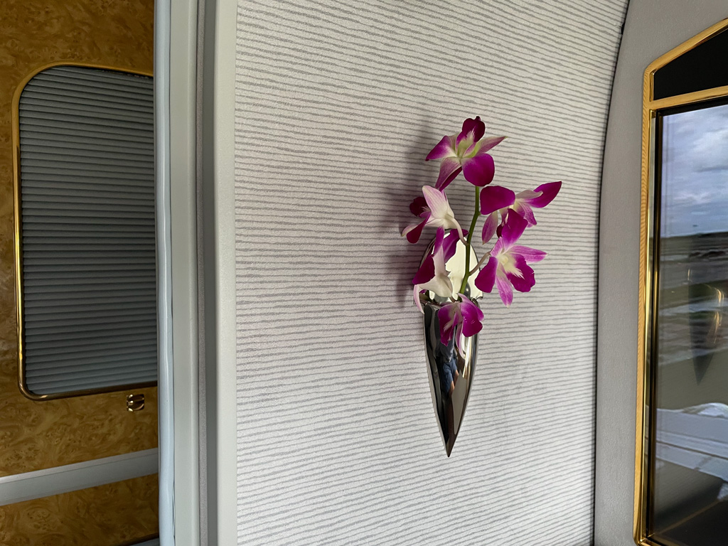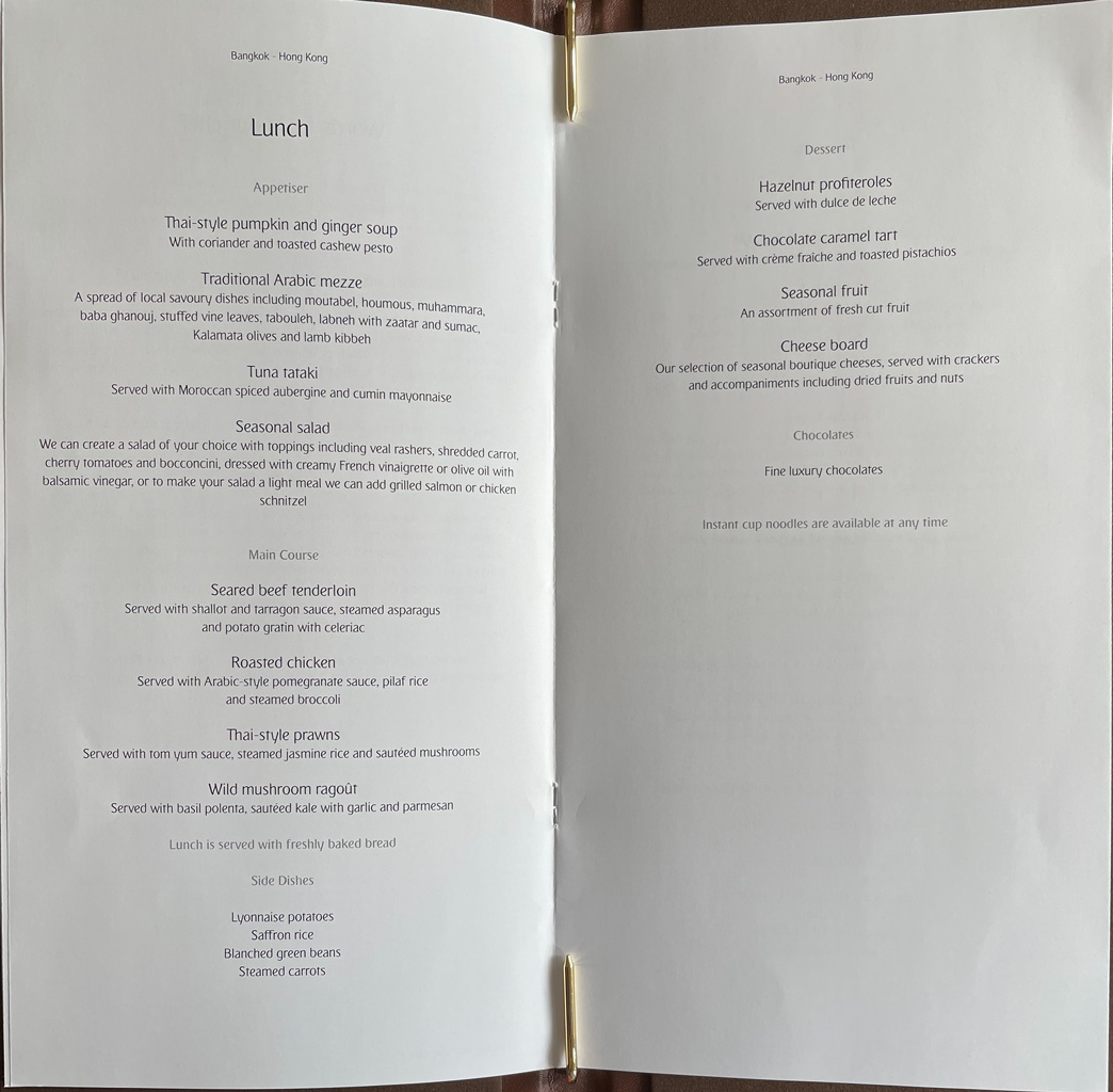 Auf dem gut zwei Stunden langen Flug nach Hong Kong waren alle Suiten der First Class gebucht. Die für meinen Platz zuständige Flugbegleiterin wies mich deswegen am Anfang des Flugs darauf hin, dass der Service sehr anstrengend werden würde und wahrscheinlich nicht alle Wünsche sofort erfüllt werden könnten.