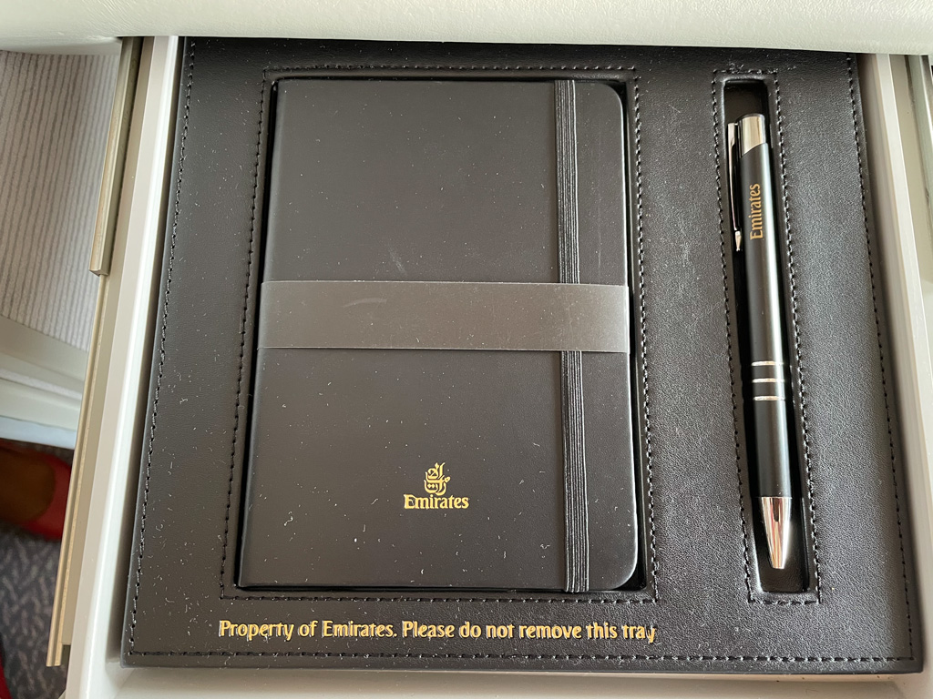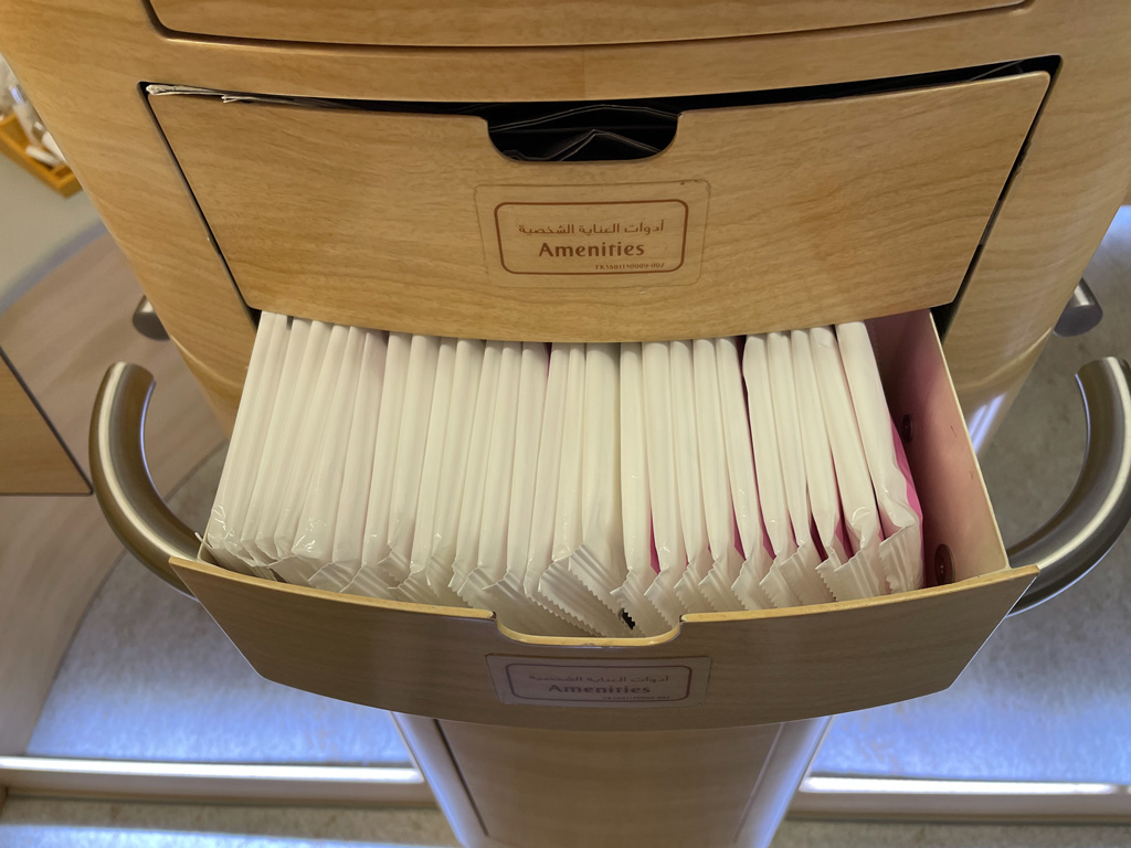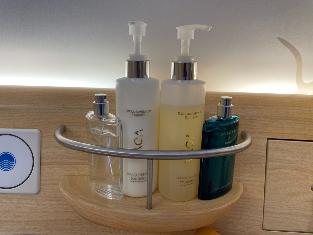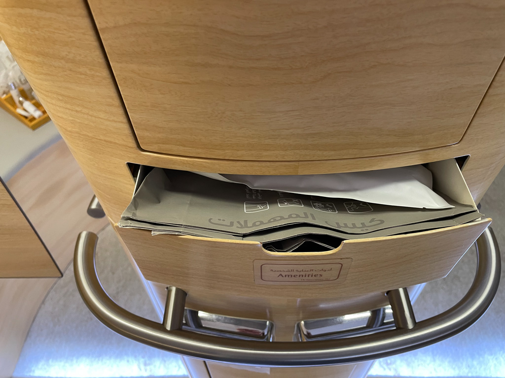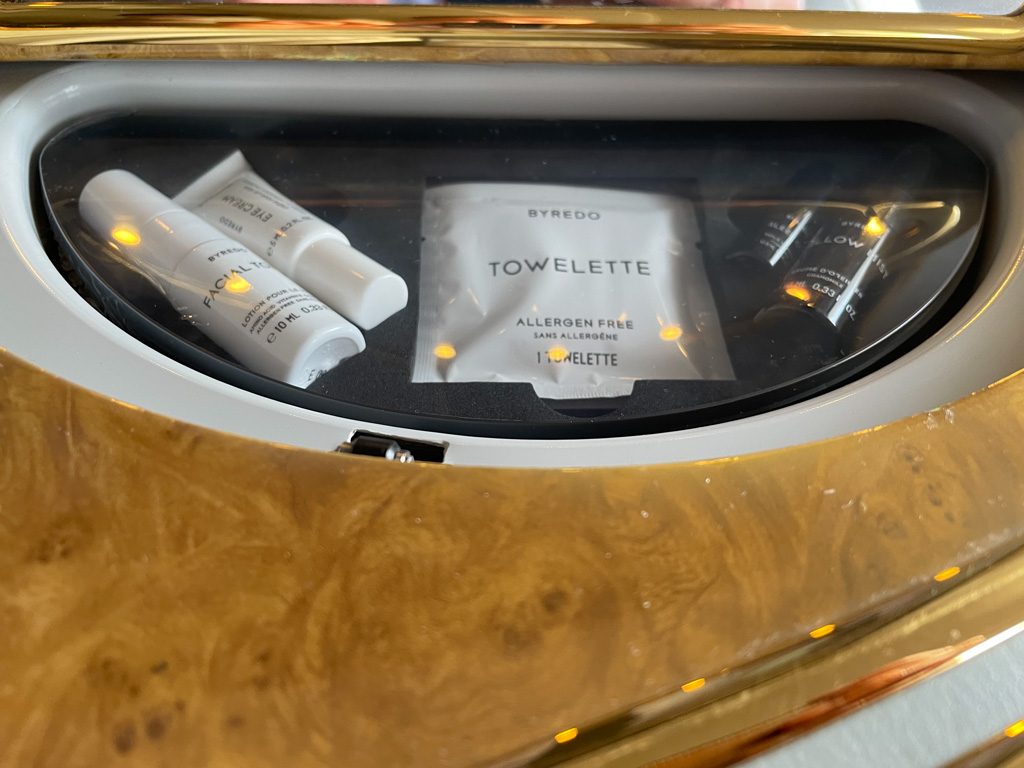 In der First Class geizt Emirates nicht mit Aufmerksamkeiten. Das Amenity Kit, wenn man so will, besteht aus allerhand einzelnen Dingen, die man erhält. Zum einen gibt es unterhalb des Monitors ein kleines Fach (das mit dem beleuteten Schminkspiegel). Darin befinden sich (in ein Tablett eingeschweißte) Pflegeprodukte.