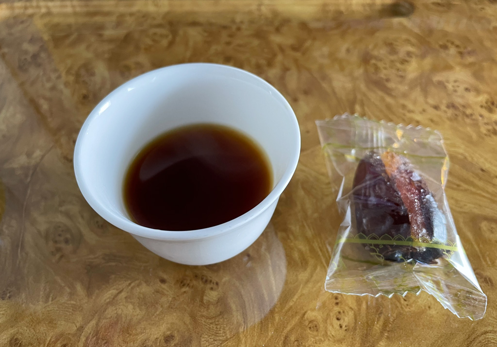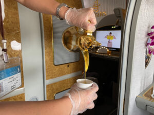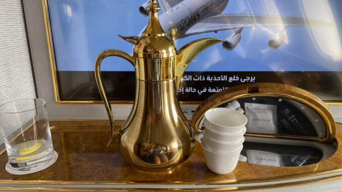 Noch vor dem Pushback des Flugzeugs wurde ich dennoch mit arabischem Kaffee und Datteln versorgt, weitere Getränke nahm ich mir aus der Minibar am Platz. Diese sind zwar nicht gekühlt, aber dennoch gut genießbar. Gleichzeitig wurde ich nach meinen Essenswünschen und den jeweiligen Getränken zu den Gängen gefragt.