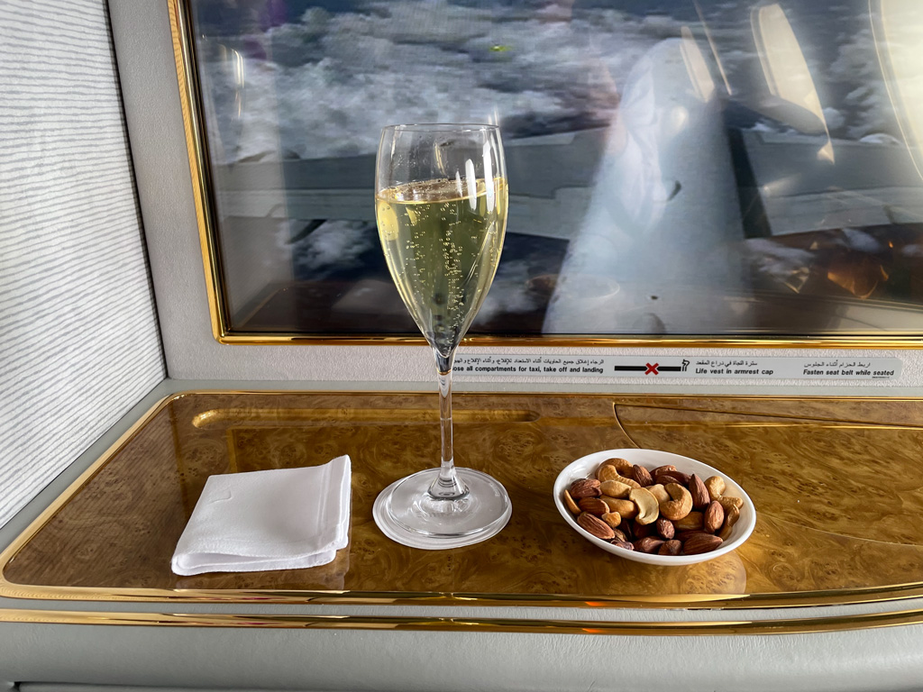 Ungefähr zwanzig Minuten nach dem Start begann der Service mit Nüssen und Schalenfrüchten (Mandel, Cashew, Pistazien und Macadamia) sowie wenigen Augenblicken später einem Glas Dom Perignon 2013.
