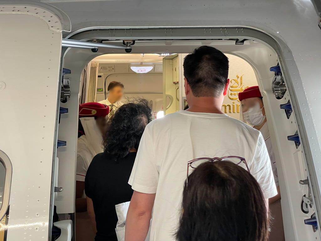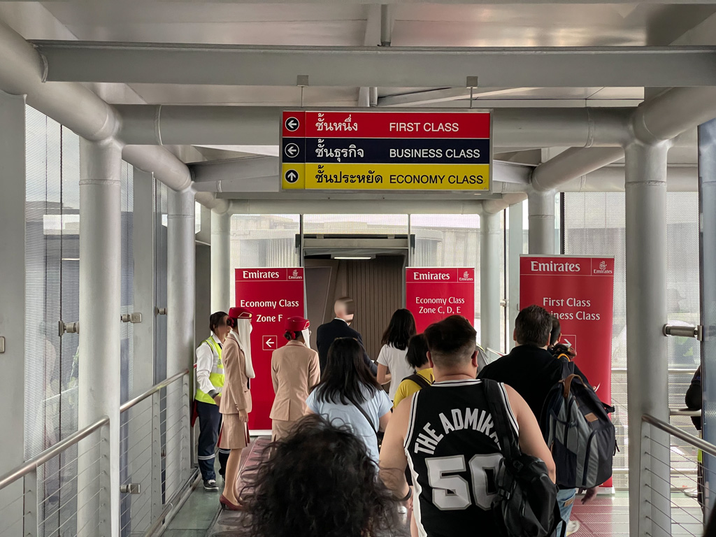 Das Gate für den Abflug von Emirates befand sich a) weit vom Gate entfernt und b) öffnete bereits eine Stunde vor Abflug. Wie an manchen Flughäfen üblich, sollen die Passagiere sich vor Abflug in dem Gatebereich versammeln und dann zügig an Bord gehen können. Da es in dem Gatebereich außer People-Watching wenig zu tun gibt, begab ich mich erst spät dorthin. Allerdings mit dem Resultat, dass ich erst relativ spät an meinem Sitzplatz eintraf, denn so ein A380 transportiert eine Menge Passagiere und an den Drehkreuzen zum Flugzeug gab es dann keine Unterscheidung mehr nach Reiseklassen.