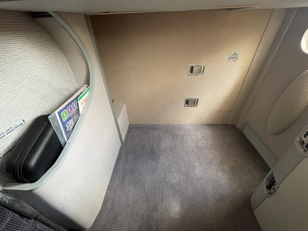 Der Stauraum für Handgepäck ist überraschend unglamourös. Dieses wird einfach unter die Fußablage gelegt und bleibt somit den Flug über in Sitzposition sichtbar.