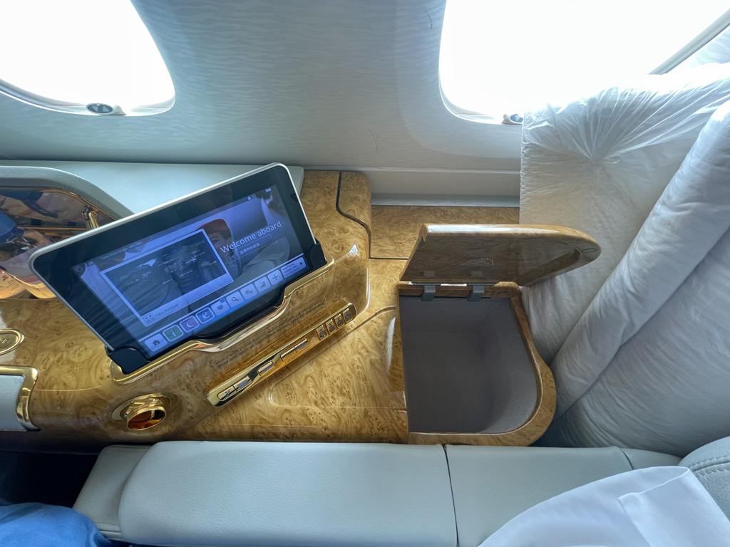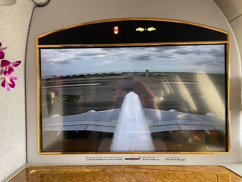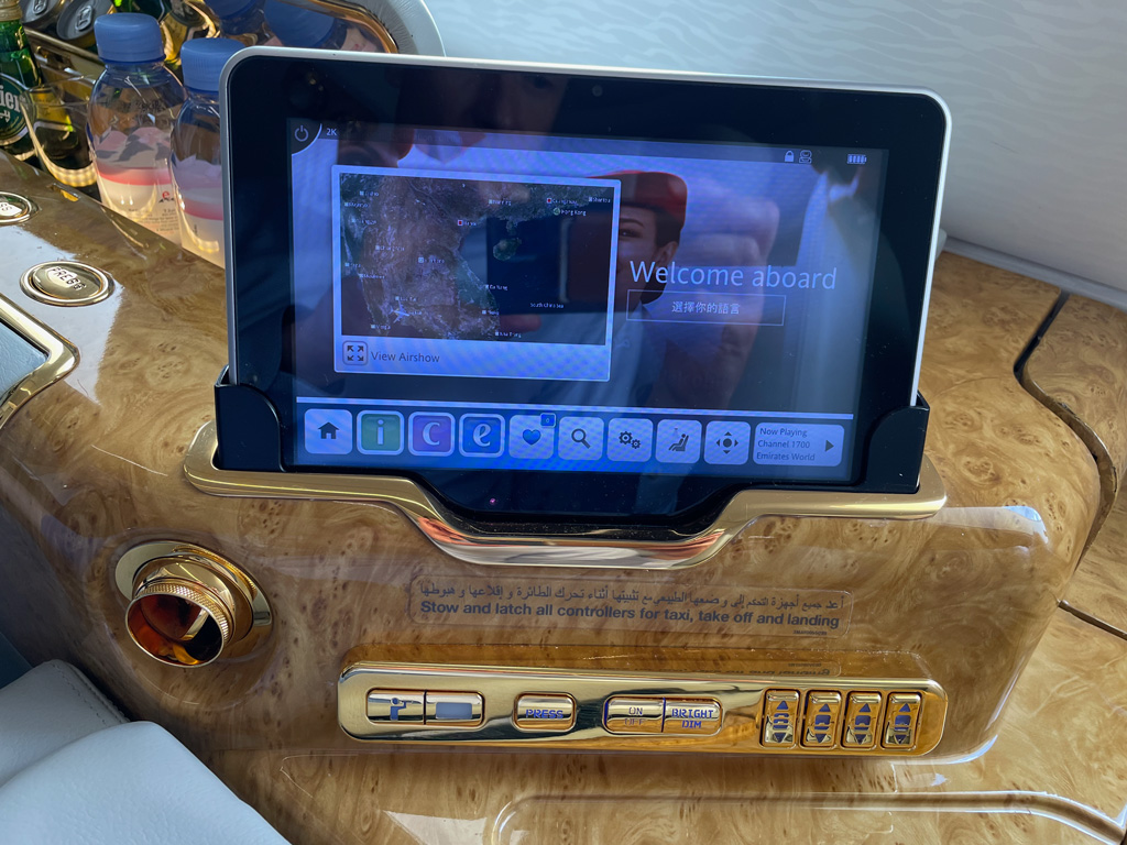 Das ICE System von Emirates bietet eine Vielzahl an Filmen, Musikalben, Podcasts, TV-Sendungen usw. Sehen kann man sie auf dem Monitor vor einem und/oder auf dem Tablet, das in jeder Suite zur Verfügung steht. Zum Start und zur Landung verfolgte ich die Flugzeugbewegungen über die Außenkameras, während des Fluges hatte ich die Karte auf dem Tablet aktiviert.
