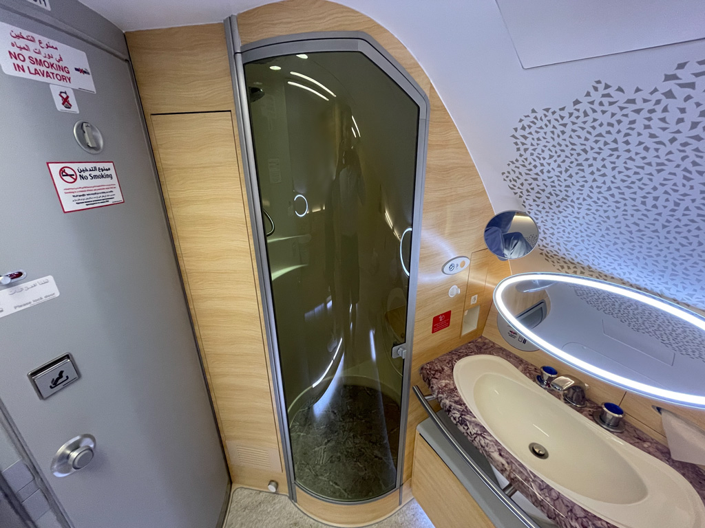 Wenn ich die Dusche nicht genutzt hätte, müsste meine Bloggerlizenz wahrscheinlich eingezogen werden. Daher reservierte ich mir gleich zu Beginn einen Zeitslot von bis zu 20 Minuten. Normalerweise vergibt Emirates 30 Minuten Slots, auf dem kurzen Flug scheint es etwas anders zu sein. Innerhalb der Badezeit erhält jeder Gast 5 Minuten (plus einen Minizuschlag) heißes Wasser.