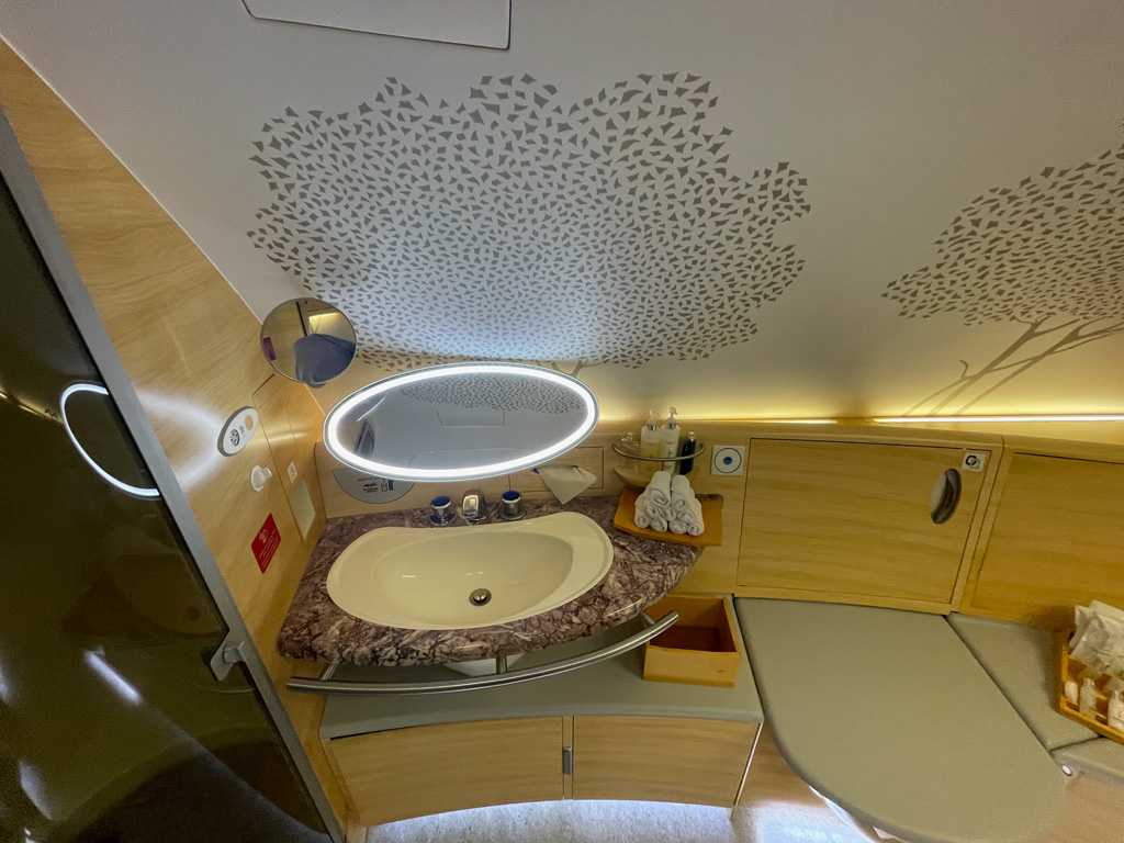 Der A380 von Emirates hat 2 Badezimmer und 2 Duschen, nicht nur das rechte Badezimmer 😉