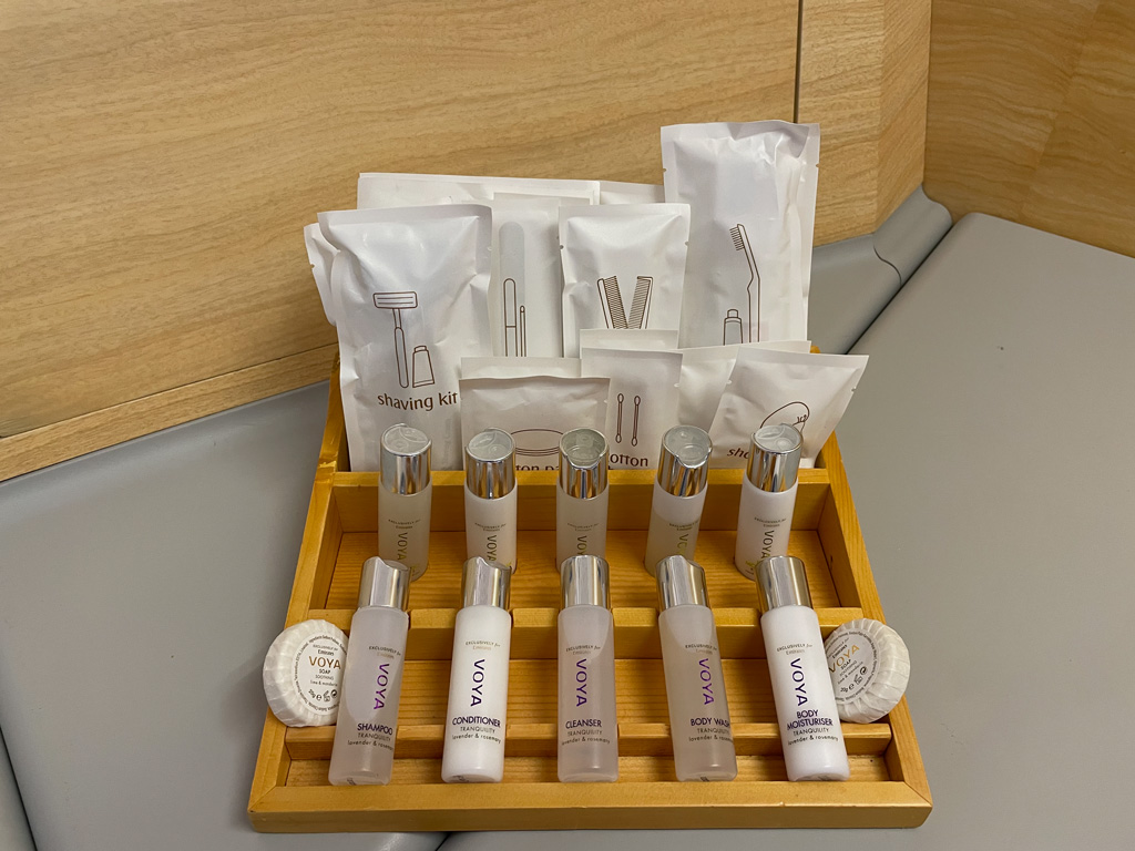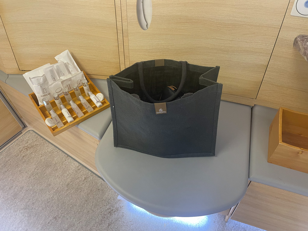 Das Amenity Kit, das Ihr bekommt, hat auf dem Flug standardmäßig nicht den vollen Umfang. Wozu auch? Allerdings erhaltet Ihr das komplette Kit, wenn Ihr duscht. In dem Fall steht eine Tasche mit allem Pippo für Euch bereit. Daher lässt sich dieser Punkt mit etwas Glück aufwerten.