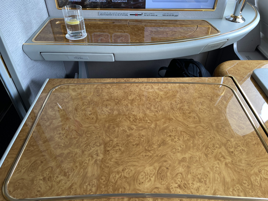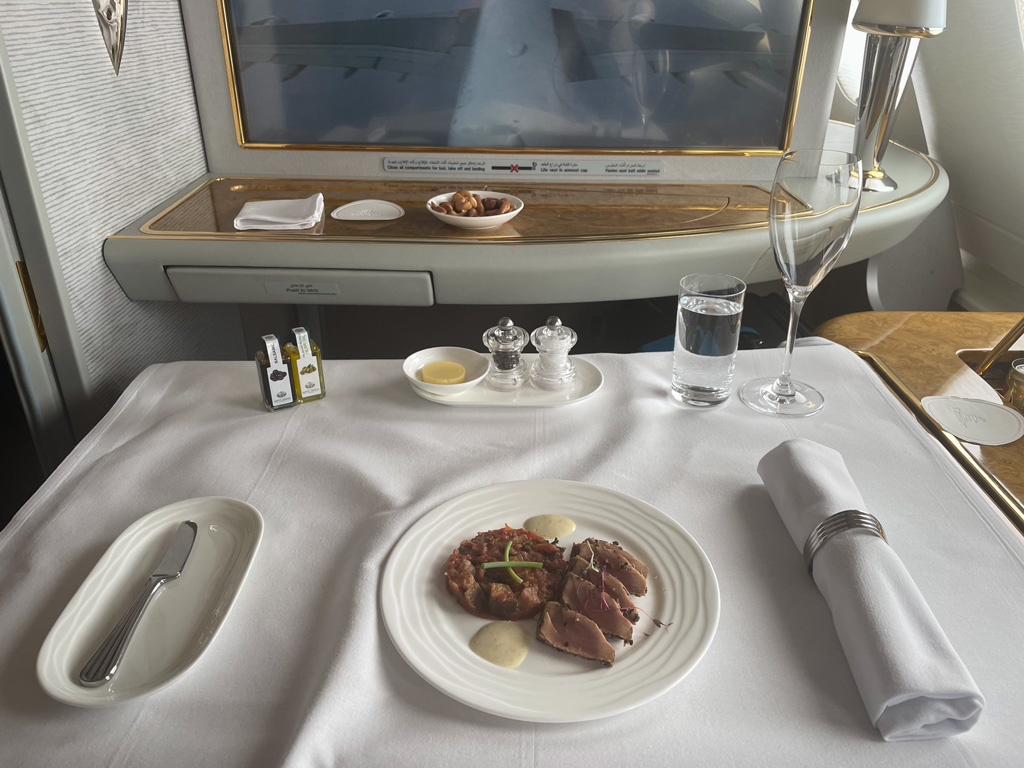 Im Flug entfällt der Kaviargang. Und damit notwendigerweise auch das „unlimited“ Kaviarangebot, das Emirates den Reisenden der First Class auf anderen Strecken bietet.