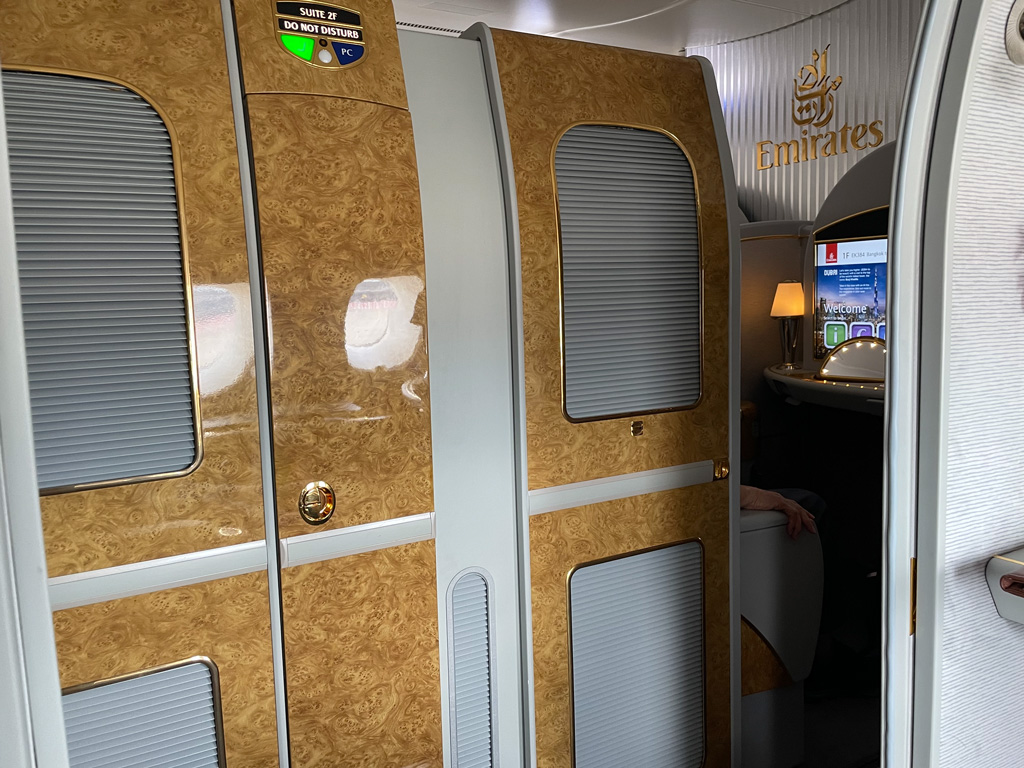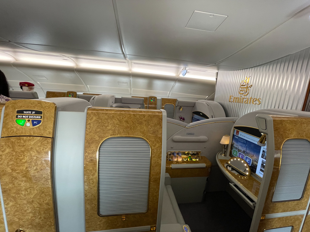 Emirates verbaut im Oberdeck des A380 14 First Class Suiten. Es gibt jeweils vier Suiten entlang der Fenster und einen Block aus zweimal drei Suiten in der Mitte. Für Einzelreisende sind die Plätze am Fenster tendenziell attraktiver, für zusammenreisende Paare diejenigen in der Mitte, da es dort eine bewegliche Trennwand gibt, sodass man sich bei Bedarf etwas näher fühlen kann. So eng wie in der Economy Class sitzt man allerdings nicht zusammen.