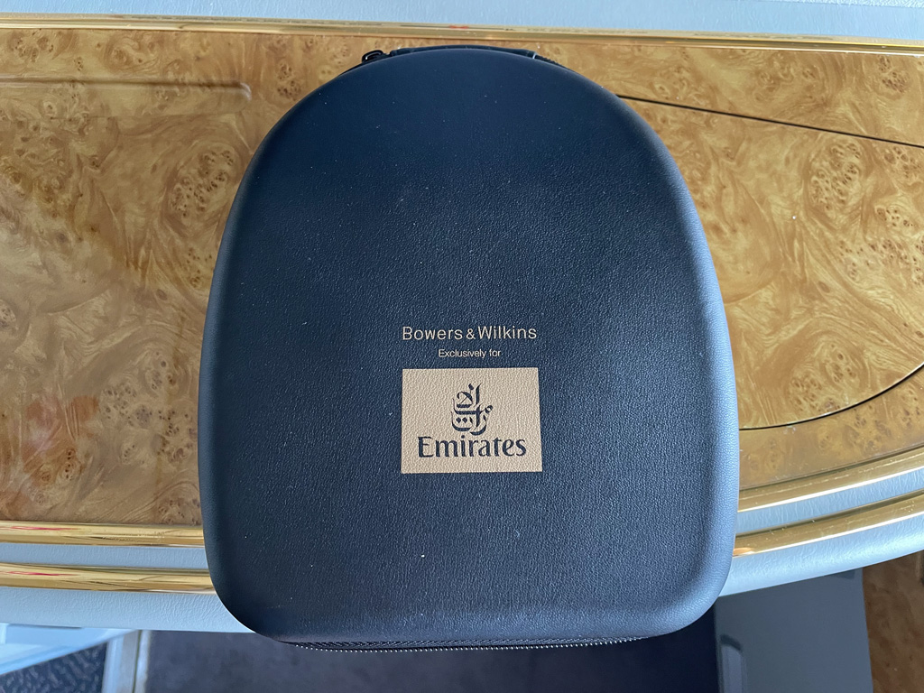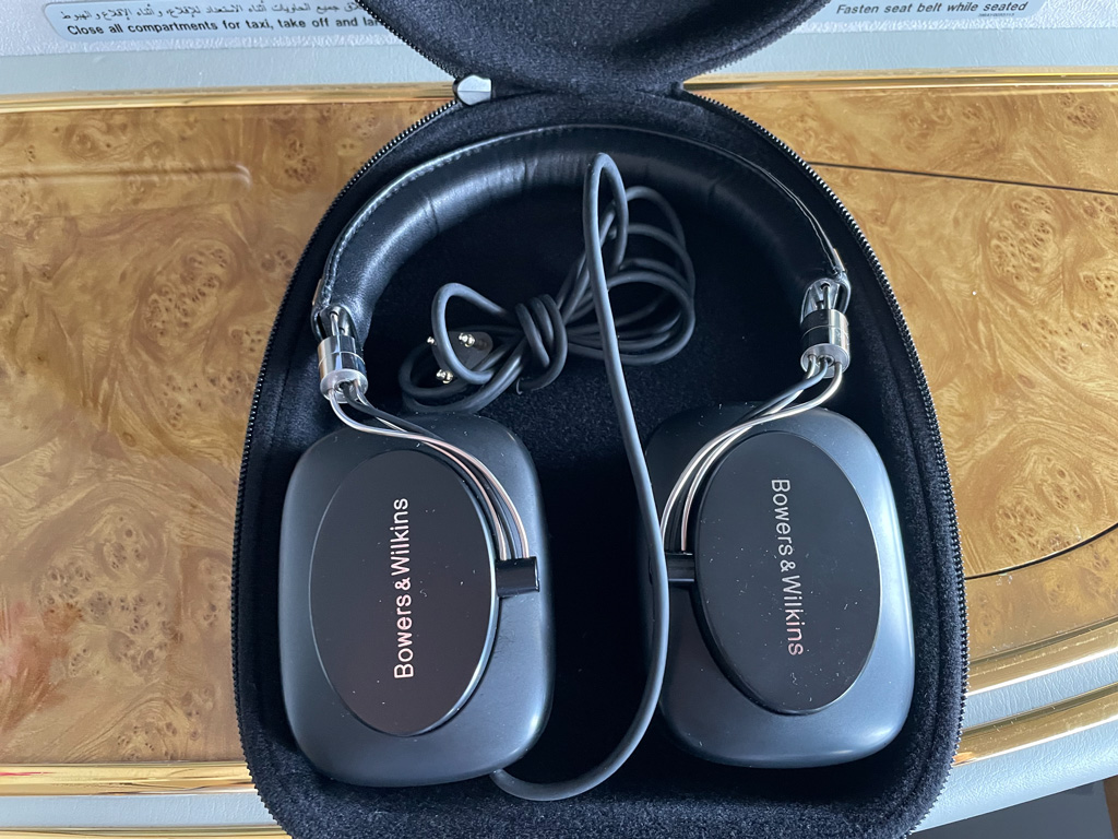Bereits beim Boarding befinden sich Noise-Cancelling Kopfhörer von Bowers & Wilkins in einem Etui in der Suite, die mit drei Pins in der Buchse angeschlossen werden.