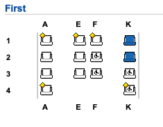 Die First Class Kabine verfügt über 14 First Class Sitze/ Suiten in einer 1-2-1 Anordnung. Hierbei wird die Privatsphäre maximiert, indem man von den Fenstersuiten durch offene Türen keinen direkten Einblick in die Mittelsuiten hat, da die Sitze leicht versetzt angeordnet sind.