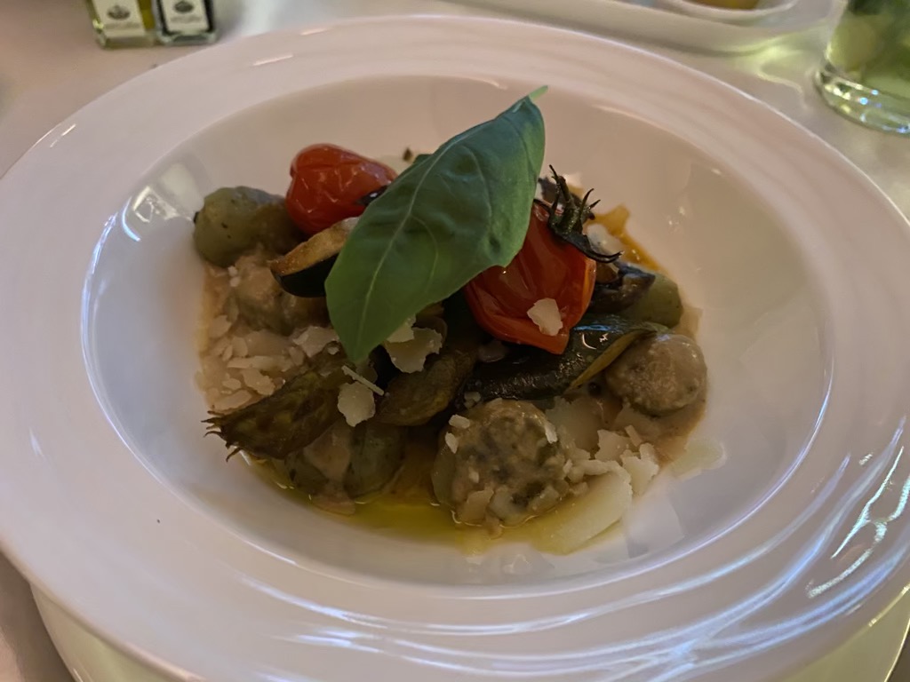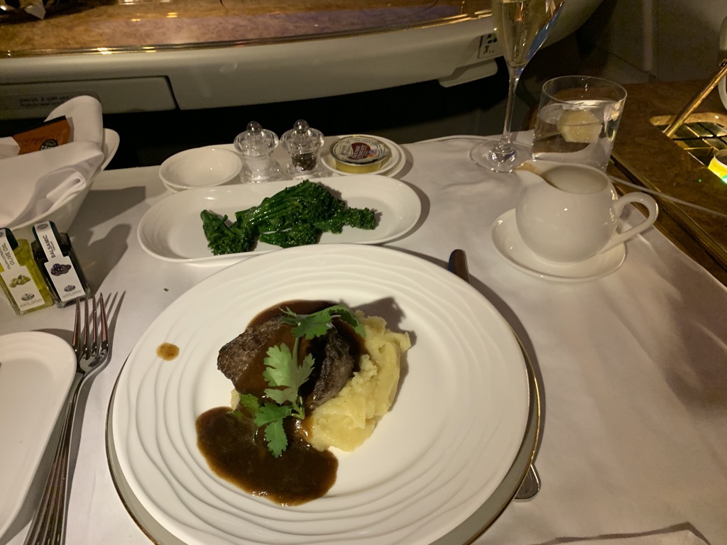 Als sich der Flug wieder beruhigt hatte, wurden die Hauptgänge gereicht. Meine Gnocchi haben super geschmeckt und waren wirklich schön angerichtet. Christoph hatte das Rinderfilet, welches wie bestellt „medium“ geliefert wurde. Er beschrieb das als Essen gut, aber nicht als besonders spektakulär.