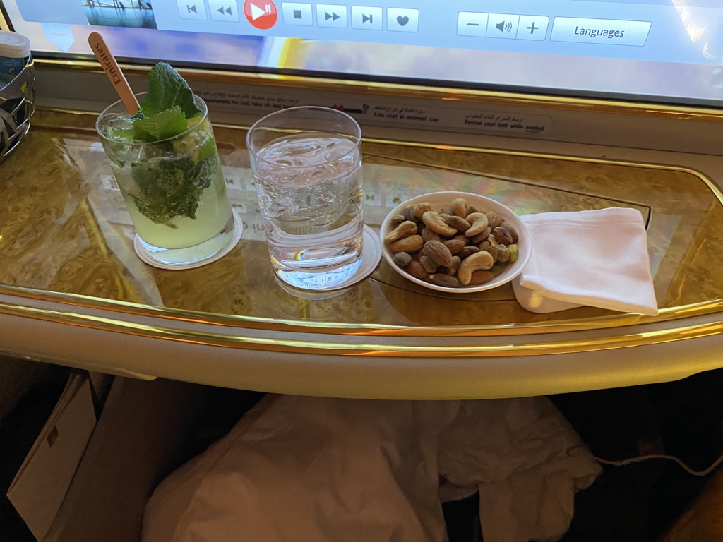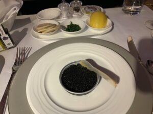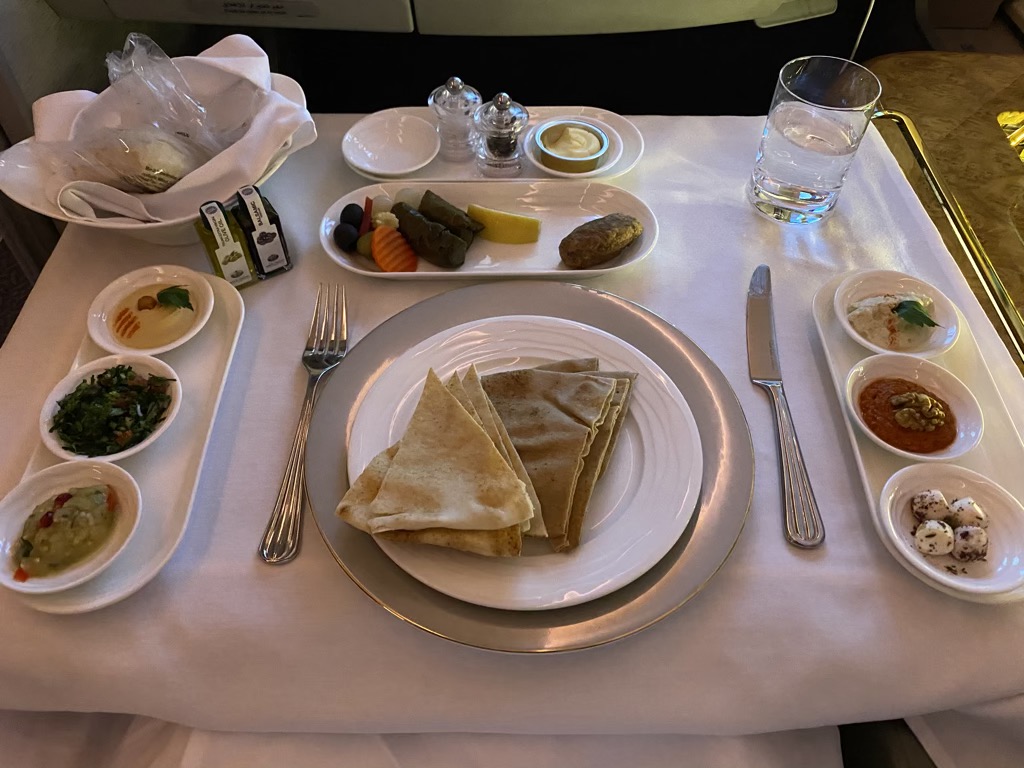 Kurz nachdem die Anschnallzeichen erloschen waren, wurden warme Nüsse und die bestellten Getränke gereicht. Wenige Minuten später wurde bereits der Tisch eingedeckt und der Appetizer gereicht, für mich diesmal das arabische Mezze, welches ich sehr lecker fand. Christoph entschied sich für Kaviar, welcher für ihn in der Emirates First Class einfach dazugehört.