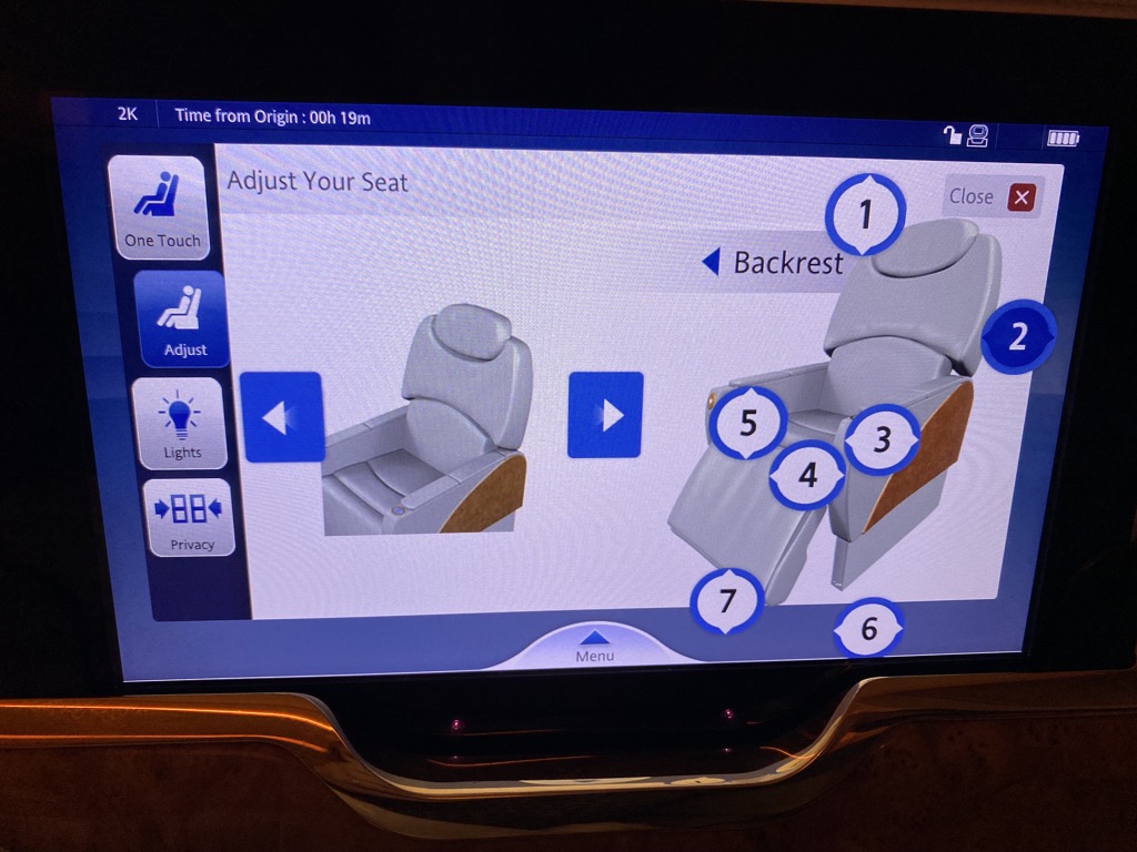Der gemütliche individuell verstellbare First Class Sessel ist in einer mit Türen verschließbaren Suite verbaut. Direkt ins Auge sticht der wirklich große Bildschirm, auf dem man sich in dem wirklich vielfältigen Entertainment Programm beschäftigen kann. Bedienbar ist der Bildschirm über ein Tablet, welches am Fenster steht, oder über die in der linken Armlehne verbauten Fernbedienung.
