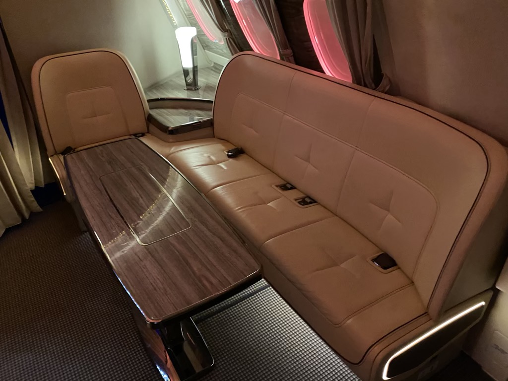 Uns erwartete die „alte“ First Class von Emirates, die sich vor allem durch viel Gold und Wurzelholz auszeichnet. Diese Kabine ist definitiv Geschmacksache. Mein Fall ist es auch nicht unbedingt, da es sehr protzig wirkt, aber das war absolut nebensächlich, denn wir wussten ja vorher was uns erwartet.