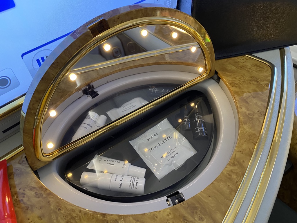 Besonders nett finde ich in der Emirates First Class auch immer den Snack Korb, der in einer Ecke vor dem Bildschirm steht, die absenkbare Minibar und den Schminkspiegel inklusive Kosmetikprodukten. Insgesamt würde ich den Sitz als gelungen beschreiben, solange bis man auf ihm schlafen will.