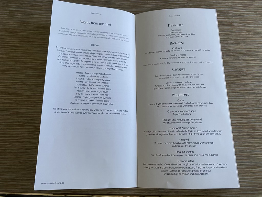 Bei Emirates wird der Service nach dem Dine on Demand Prinzip durchgeführt. Das heißt, dass es keine festen Servicezeiten gibt und man essen kann, wann man möchte. Dieses Konzept finde ich persönlich sehr angenehm, zumal man oft schon in der Lounge ein paar Kleinigkeiten isst und die erste Zeit auf dem Flug keinen Hunger hat. Dies war auch der Grund, warum wir beide auf das angebotene Frühstück verzichtet haben.