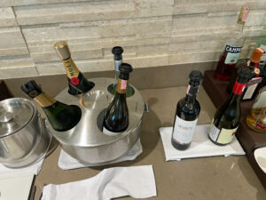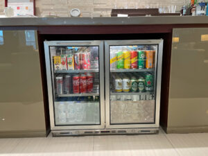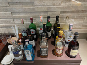 Das Getränkeangebot in der Lounge ist umfangreich. So gibt es neben den Klassikern der Coca Cola Company (hier gibt es Diet Coke, aber keine Coke Zero) stehen hier auch verschiedene Softdrinks von Schweppes zur Verfügung. Es gibt mit Heineken, Singha und Chang drei verschiedene (Dosen-)Biere, dazu Säfte und (Soja-)Milch sowie stilles Wasser und Sprudel. Dank des Exklusivvertrags von Emirates mit LVMH gibt es Moet & Chandon Champagner nur noch ein Emirates Lounges. Selbstverständlich gibt es auch Rot- und Weißwein. Wer bei der eigenen Alkoholisierung zielstrebig vorgehen möchte, kann auf eine umfangreiche Spirituosenauswahl zurückgreifen, die mehrere Whiskys/Whiskeys und Exoten wie Cointreau und Kahlua umfasst.