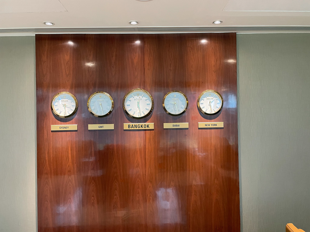 Bereits in der Lounge beginnt Emirates mit dem gewissen Glamour-Faktor, den die Airline auch an Bord der Flugzeuge pflegt. Holzdekor und Goldakzente heben die Lounge optisch stark ab. Dass die Weltzeituhren mit Rolex-Branding versehen sind, ist da nur folgerichtig. Das Publikum ist gemischt, wobei es schon einen gewissen „Sehen und gesehen werden“-Faktor gibt. Und natürlich Instragramer und TikToker, die dort fleißig Content produzieren.