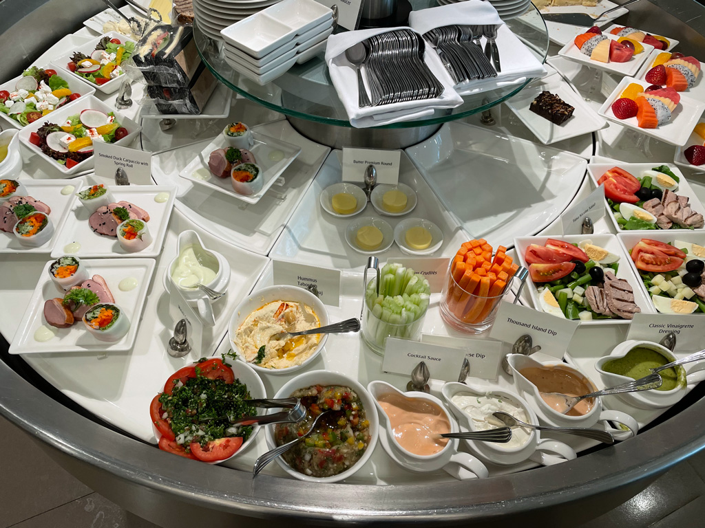 In einem Rondell werden die gekühlten Speisen präsentiert. Dazu gehören z.B. Salate, Rohkost, Entencarpaccio, aber auch verschiedene Kuchen, Käse oder geschnittenes Obst. Bei den warmen Speisen umfasste die Auswahl gedünsteten Lachs, verschiedene Satay, Chana Masala, verschiedene Pfannengerichte und Gemüse. Insgesamt ein eher panasiatisch geprägtes Buffet, das geschmacklich und qualitativ überzeugen konnte.