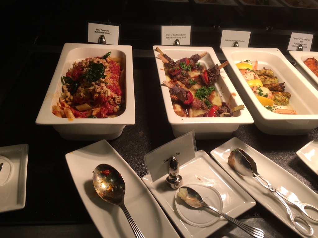 Auf dem Buffet im Restaurantbereich findet man mehrere verschiedene warme Hauptspeisen, sowie kalte Vorspeisen, Salate und Desserts. Grundsätzlich ist das Angebot sehr umfangreich und man kann hier problemlos eine vollständige Malzeit vor dem Flug einnehmen, allerdings verzichtet man beispielsweise im Gegensatz zur Etihad Lounge in Melbourne auf ein a la carte Menü.
