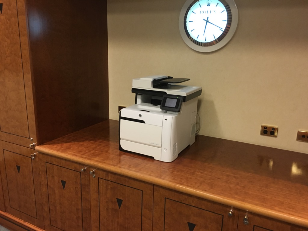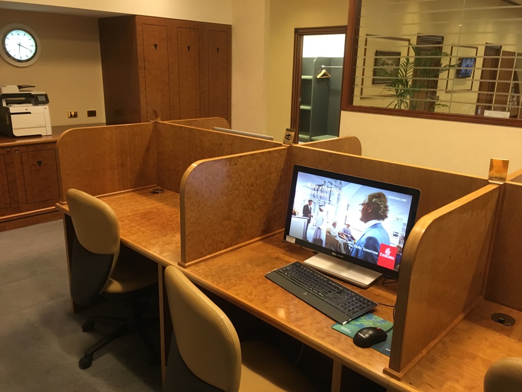 Direkt neben dem vorderen Loungebereich, befindet sich das Business Center. Auch hier dominieren wieder die Emirates typischen Wurzelholz Töne. Sehr positiv fand ich das Vorhandensein eines eigenen Druckers für die Lounge, was leider nicht selbstverständlich ist.