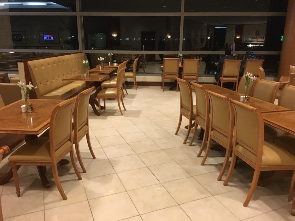 Hinter dem Front Desk, an welchem die Gäste freundlich in der Emirates Lounge begrüßt werden, erstreckt sich die Lounge entlang der großen Fensterfronten. Dabei ist sie in drei Teile unterteilt. Direkt hinter dem Eingang befindet sich ein Loungebereich, anschließend das Restaurant und dann wieder ein Loungebereich.