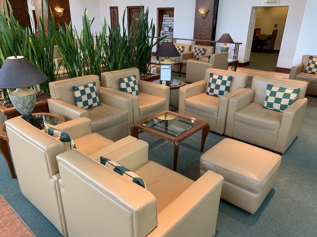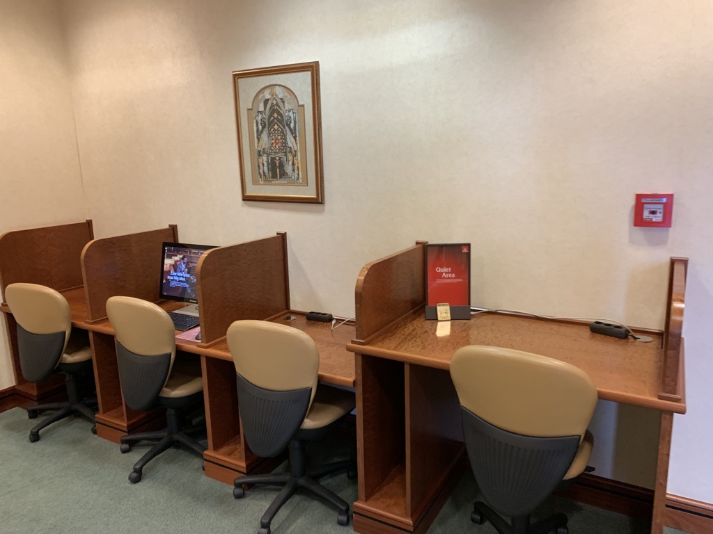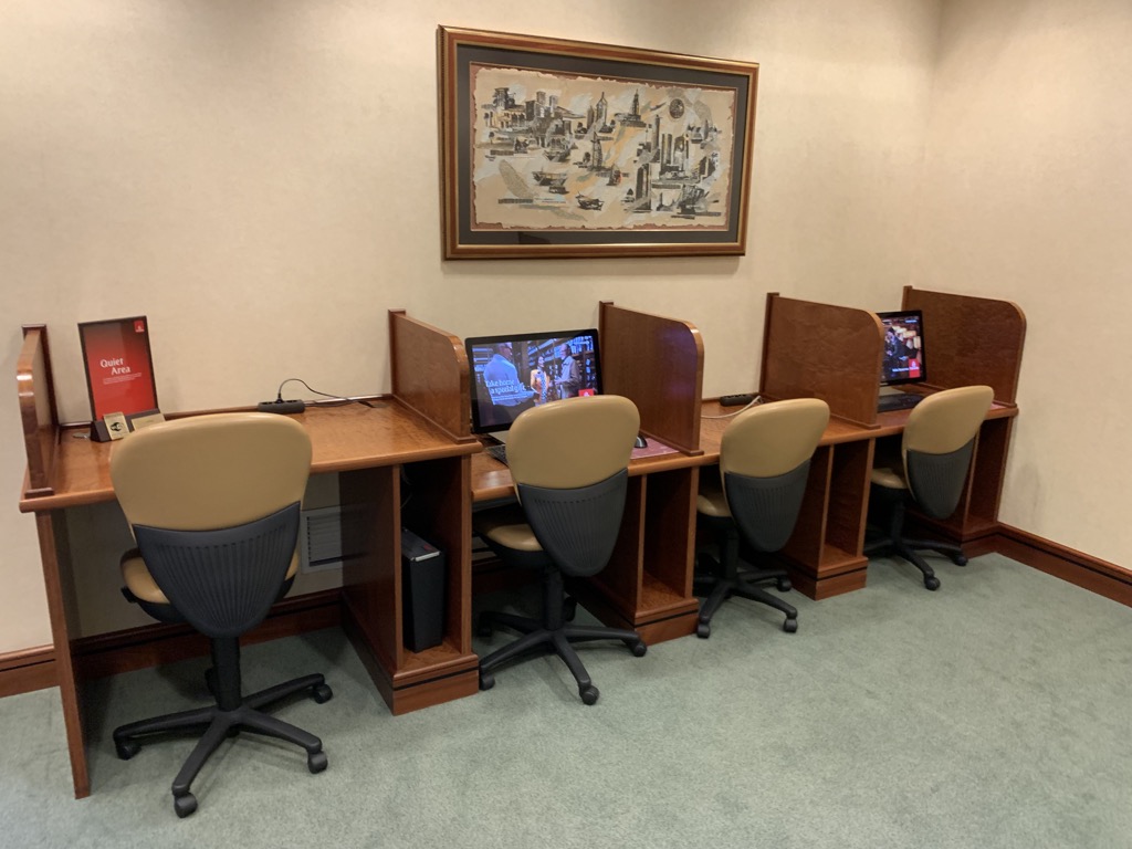 Direkt nach dem Eingang gab es auch ein großes Business Center, welches neben mehreren Arbeitslätzen auch einige Computer und einen Drucker bot. Die ganze Lounge verfügte natürlich auch über schnelles WIFI Internet, nur an verfügbare Steckdosen hat man sich leider nicht überschlagen, was auch daran liegen könnte, dass die Lounge schon in ihrem Konzept über 15 Jahre alt ist und man damals wohl noch nicht im Schnitt 4-5 Geräte gleichzeitig laden wollte.